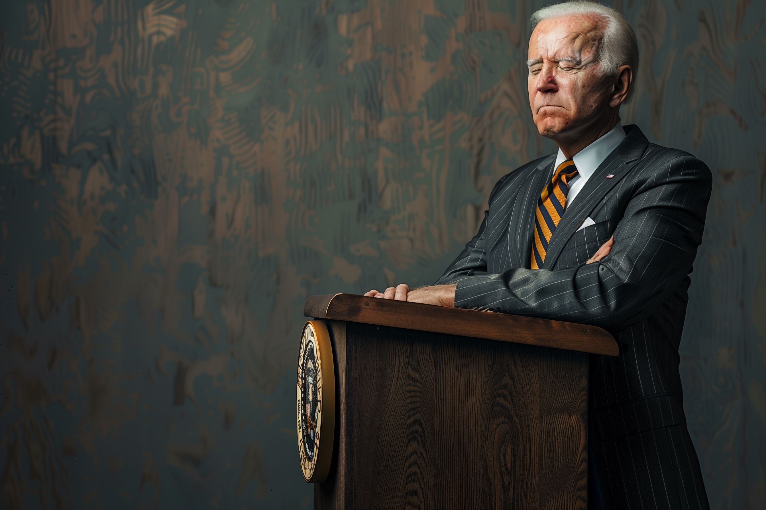Das Foto zeigt einen ernsten, älteren Politiker an einem Rednerpult mit einem Wappenemblema. Der Mann trägt einen dunklen Anzug mit Krawatte und blickt ernst und nachdenklich in die Kamera. Das Bild vermittelt den Eindruck von Macht, Führung und professioneller Haltung, wie sie oft bei politischen Reden und Pressekonferenzen zu sehen ist. Dieses Stockfoto eignet sich daher gut für Beiträge rund um das Thema Politik, Regierung oder Business und kann in hoher Auflösung und unter einer Creative-Commons-Lizenz kostenfrei verwendet werden.