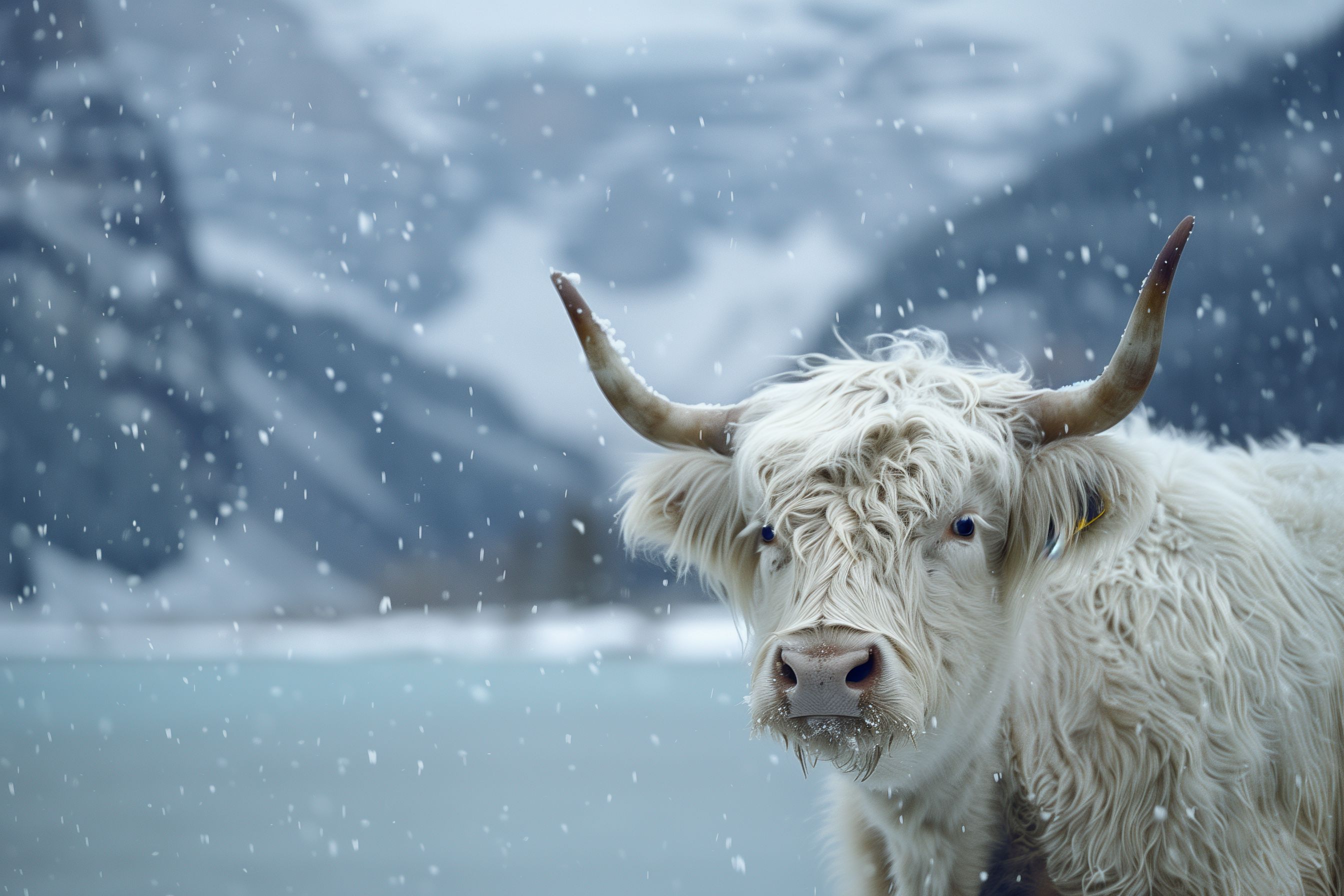 Das Bild zeigt einen majestätischen weißen Hochlandochsen inmitten eines winterlichen Schneesturms. Das Tier steht ruhig und gelassen in der Schneelandschaft, sein langes, welliges Fell weht im Wind. Der Hintergrund ist verwischt, der Fokus liegt ganz auf dem Ochsen, der mit seinem markanten Gesichtsausdruck und den stattlichen Hörnern beeindruckt. Dieses Stockfoto eignet sich hervorragend für den Einsatz in Blogbeiträgen, Newslettern oder sozialen Medien zum Thema Winter, Natur oder Wild- und Nutztiere. Es ist in hoher Auflösung verfügbar und unter einer Creative-Commons-Lizenz frei verwendbar.