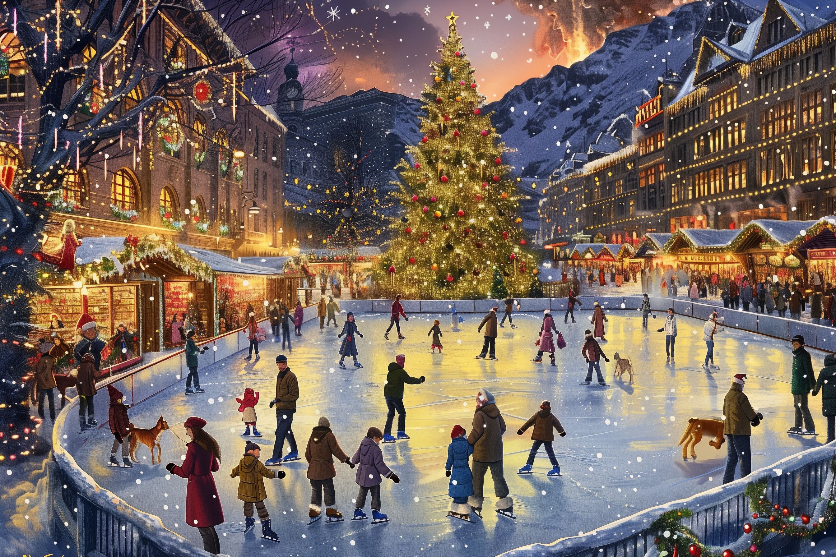 Dieses detailreiche Foto zeigt eine winterliche Weihnachtsmarkt-Szene mit einer Eislaufbahn im Zentrum. Die Straße ist mit festlicher Beleuchtung und einem prächtigen Weihnachtsbaum geschmückt, umgeben von historischen Gebäuden. Viele Menschen, teilweise in warmen Wintermänteln, genießen das Eislaufen auf der beleuchteten Bahn. Im Hintergrund sind verschneite Berge und ein orangefarbener Abendhimmel zu sehen, was eine stimmungsvolle Atmosphäre schafft.