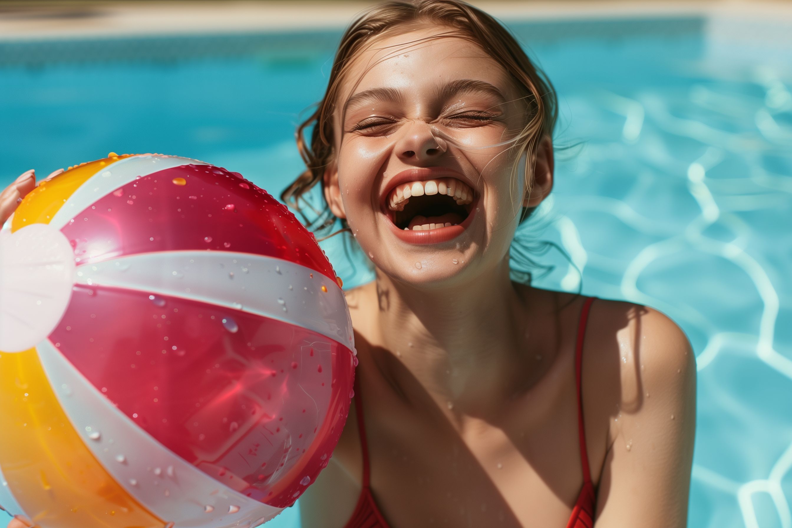 Das Bild zeigt eine junge, glückliche Frau, die im Wasser eines Pools sitzt und einen bunten Wasserball in die Luft wirft. Sie lacht fröhlich und scheint die Sommerfreude in vollen Zügen zu genießen. Das Bild strahlt pure Lebensfreude und Spaß aus und ist ideal für den Einsatz in Blogbeiträgen, Newslettern oder Werbekampagnen zum Thema Urlaub, Erholung und Sommerfreude. Als hochwertiges, kostenloses Stockfoto unter Creative Commons-Lizenz kann es vielfältig eingesetzt werden.
