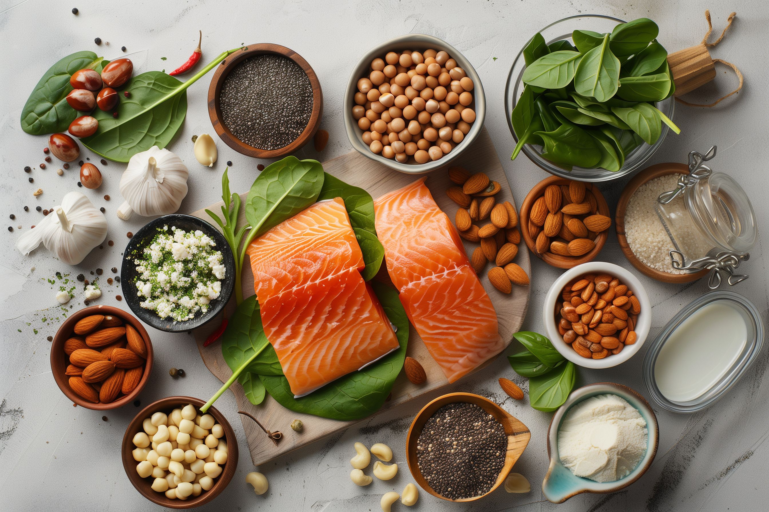 Dieses detailreiche Foto zeigt eine Auswahl an hochwertigen Lebensmitteln für eine ausgewogene und gesunde Ernährung. Auf einem natürlichen Holzhintergrund sind verschiedene Zutaten wie Lachsfilet, Nüsse, Hülsenfrüchte, Blattgemüse und Gewürze ansprechend arrangiert. Die Flat-Lay-Perspektive und das natürliche Licht verleihen dem Bild einen frischen und einladenden Look. Dieses Foto eignet sich perfekt für Blogs, Newsletter, Social-Media-Posts oder Werbeanzeigen rund um Themen wie Ernährung, Gesundheit und Wellness. Es ist ein hochwertiges Stockfoto in hoher Auflösung, das unter der Creative-Commons-Lizenz genutzt werden kann.