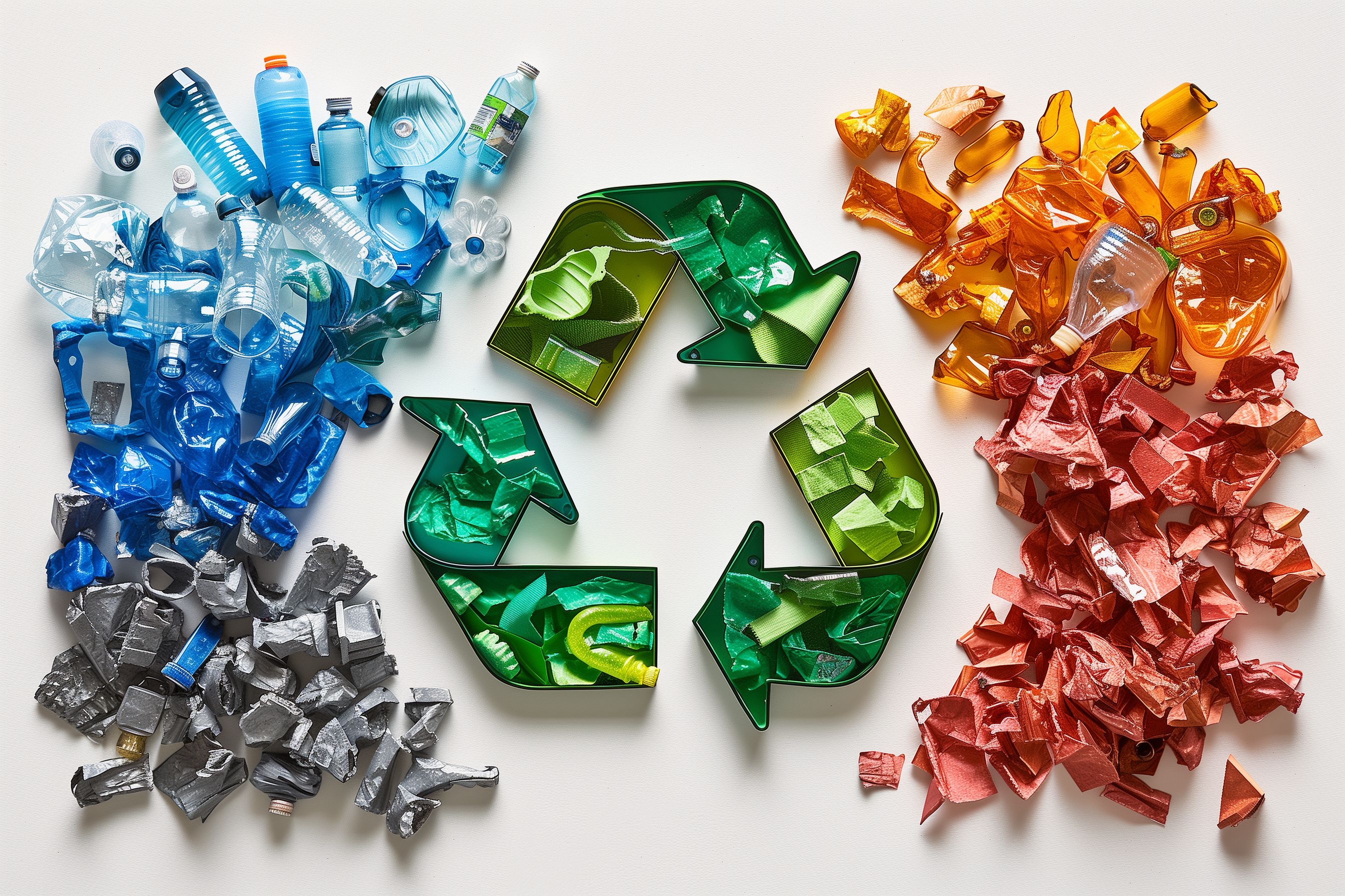 Dieses Bild zeigt sortierte Kunststoffabfälle, die zur Wiederverwertung bereit sind. Verschiedene Plastikteile in den Farben Blau, Grün und Orange sind in den Recycling-Symbolen angeordnet. Die Perspektive legt den Fokus auf den Recyclingprozess und die Notwendigkeit von Mülltrennung für eine nachhaltigere Zukunft. Dieses Stockfoto eignet sich hervorragend für Blogs, Newsletter, Social-Media-Beiträge und Werbematerial zum Thema Umweltschutz, Recycling und Kreislaufwirtschaft. Es ist in hoher Auflösung verfügbar und steht unter einer Creative-Commons-Lizenz zur Verfügung.