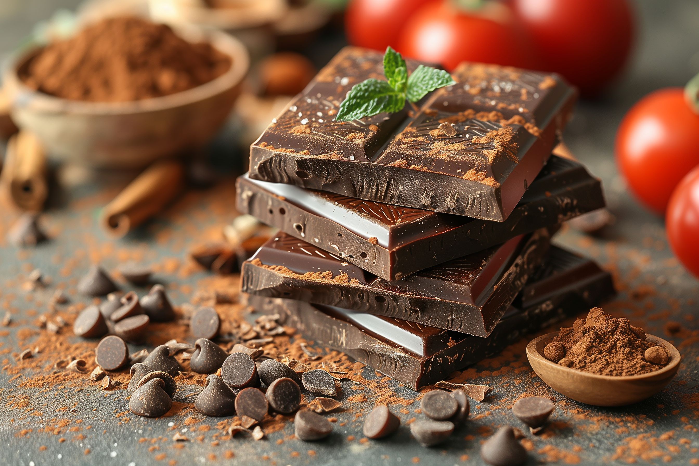Dieses Foto zeigt eine Anordnung von leckeren Schokoladentafeln, die mit Zimtgewürz und Minzblättern garniert sind. Die Schokolade hat eine dunkel-glänzende Oberfläche und ist in rustikale Stücke gebrochen. Umgeben sind die Tafeln von Kakaopulver und einzelnen Schokoladenstückchen, die den sinnlichen Eindruck des Fotos unterstreichen. Das Bild vermittelt einen appetitlichen und natürlichen Genuss und eignet sich perfekt als hochwertiges Stockfoto für Themen rund um Süßwaren, Ernährung oder Gastronomiebereiche. Das kostenlose Foto in hoher Auflösung kann unter der Creative-Commons-Lizenz genutzt werden.