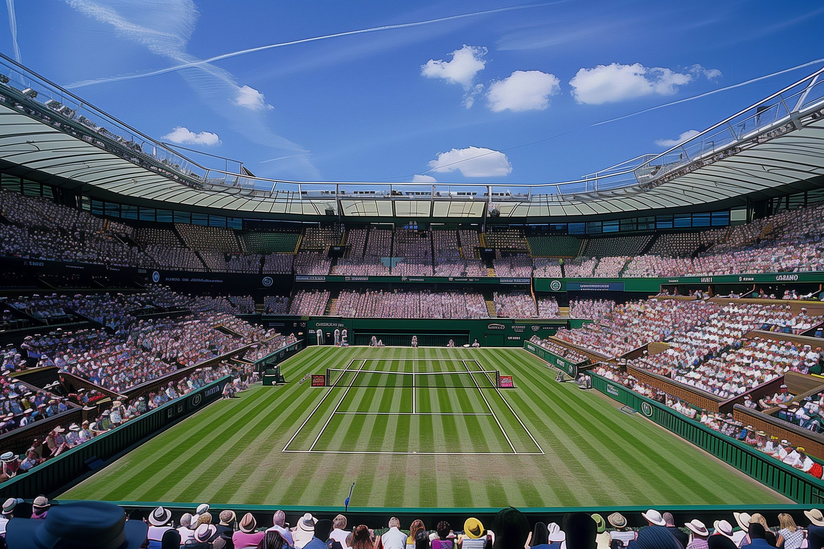 Das Foto zeigt die beeindruckende Szenerie des Wimbledon-Tennisturniers. Zu sehen ist der grüne Tennisplatz, umgeben von den voll besetzten Zuschauerrängen. Der Blick schwenkt über das Stadion mit seinen charakteristischen Tribünen und Dächern. Der wolkenlose blaue Himmel und die natürliche Beleuchtung tragen zu der lebendigen Atmosphäre bei. Dieses Bild eignet sich hervorragend für die Verwendung in Sportberichten, Reiseblogs oder Werbematerialien rund um Großereignisse im Profisport. Es ist ein hochwertiges, kostenloses Stockfoto unter Creative-Commons-Lizenz, das in hoher Auflösung zur Verfügung steht.