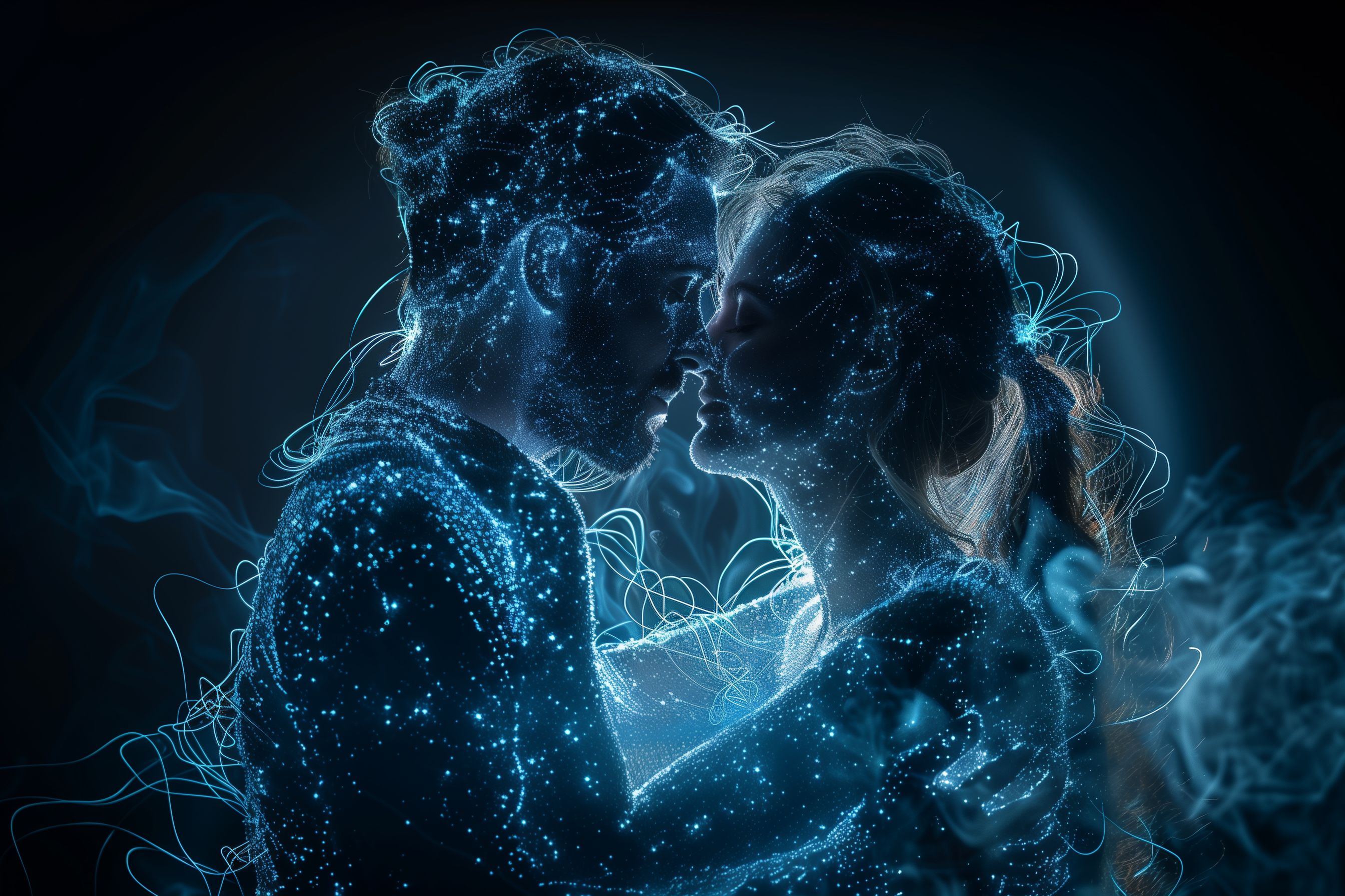 Das Bild zeigt ein glitzerndes Liebespaar, das sich leidenschaftlich umarmt. Die Figuren sind von einem blauen, neonartigen Licht umgeben, das einen fantastischen und mystischen Eindruck erweckt. Funkelnde Sterne und abstrakte Linien verleihen dem Bild eine digitale, fast schwebende Ästhetik. Diese stimmungsvolle Komposition lässt sich hervorragend für eine Vielzahl von Anwendungen wie Blogs, Newsletter oder Social-Media-Kampagnen einsetzen, bei denen ein romantischer, emotionaler Touch gefragt ist. Dieses hochauflösende Stockfoto steht unter einer Creative-Commons-Lizenz kostenlos zum Download bereit.