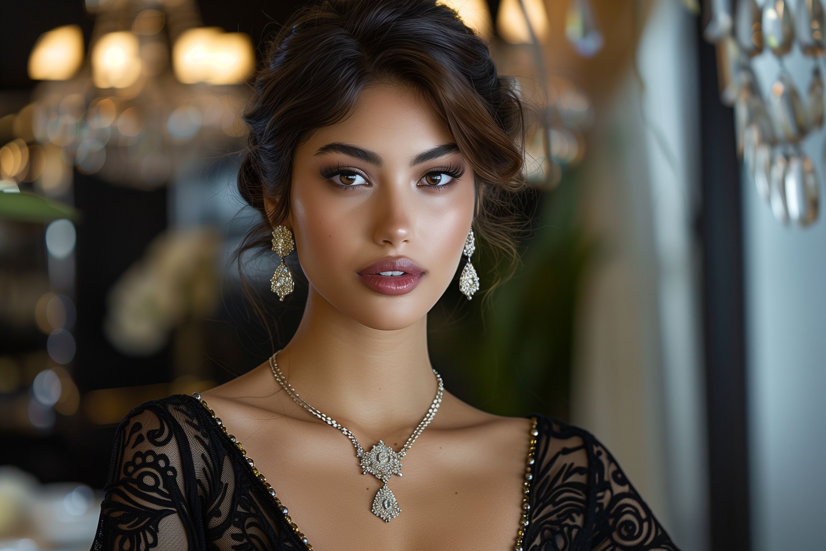 Dieses Foto zeigt eine wunderschöne, selbstbewusste Frau in einem prachtvollen Abendkleid. Das opulente, schwarz-glitzernde Kleid schmeichelt ihrer Figur und verleiht ihr einen eleganten, glamourösen Look. Ihr Gesichtsausdruck strahlt Stolz und Selbstvertrauen aus. Der Schmuck - eine üppige Halskette und aufwendige Ohrringe - unterstreichen den edlen, luxuriösen Stil. Das Foto könnte für verschiedenste Anwendungsfälle wie Mode-Editorials, Hochzeits-Blogs oder Luxus-Werbung verwendet werden. Als hochwertiges Stockfoto in hoher Auflösung steht es unter einer Creative-Commons-Lizenz zur Verfügung.
