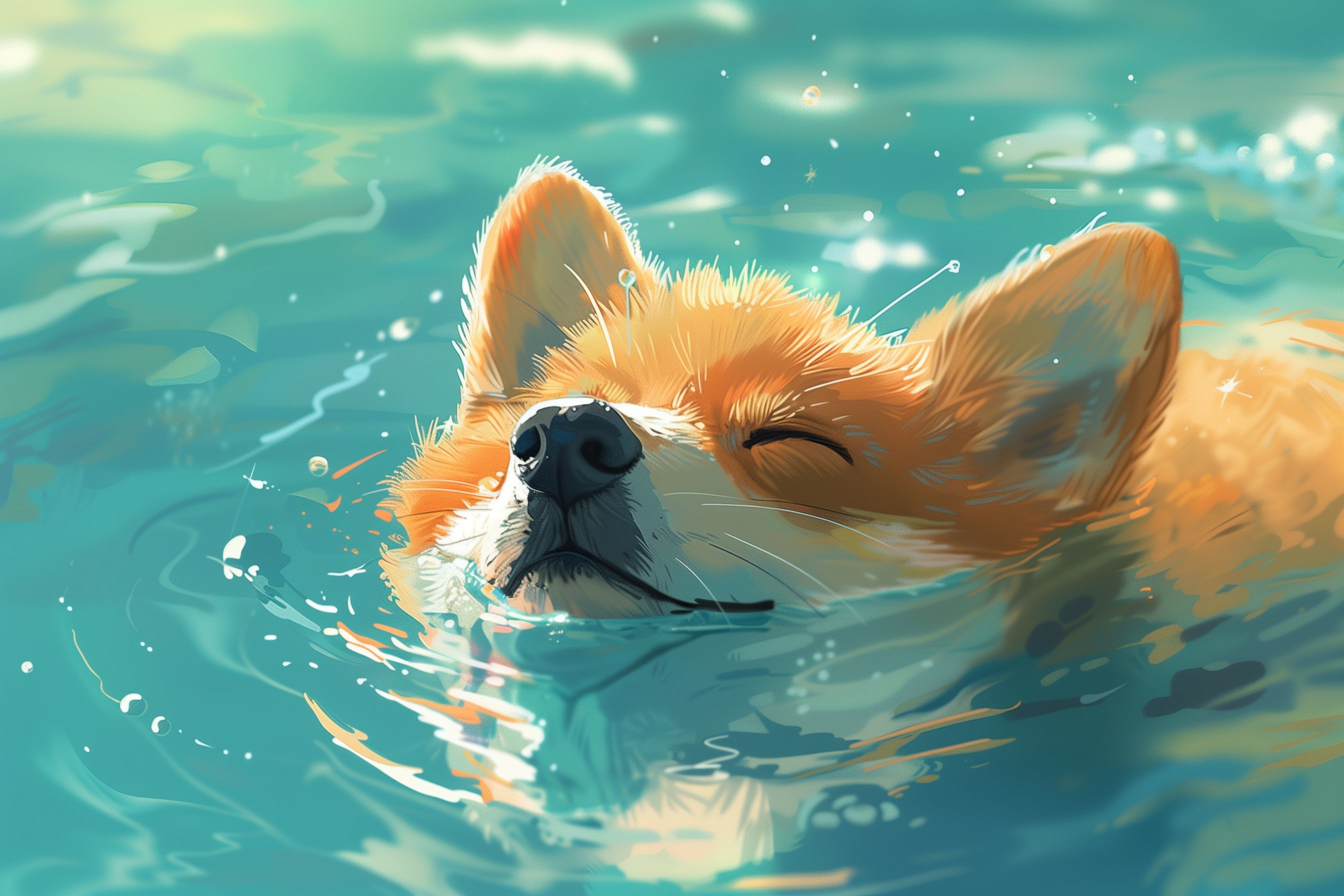 Das Bild zeigt einen verträumt schwebenden Corgi, der auf dem Rücken liegend in einem türkisblauen Gewässer schwimmt. Der Hund hat die Augen halb geschlossen und genießt sichtlich die Entspannung im Wasser. Die Szene ist in einem sanft aquarellierten Stil dargestellt, mit weichen Übergängen und leuchtenden Farbtönen. Die Komposition lenkt den Blick direkt auf den friedlich schwimmenden Vierbeiner, der wie ein Teil der Umgebung zu sein scheint.