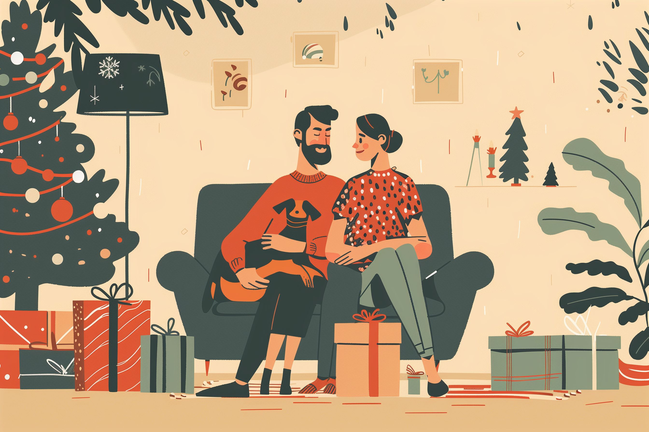 Diese liebevoll illustrierte Weihnachtsszene zeigt ein gemütliches Wohnzimmer mit einem Paar, das auf der Couch sitzt und einen Hund streichelt. Im Hintergrund ist ein geschmückter Weihnachtsbaum zu sehen, umgeben von Geschenken und dekorativen Elementen. Die Illustration zeichnet sich durch warme Farben, detaillierte Gestaltung und eine harmonische Komposition aus, die eine behagliche, familiäre Atmosphäre vermittelt. Dieses Stockfoto eignet sich hervorragend für Weihnachts-Layouts, Grußkarten, Blogs oder Social-Media-Beiträge rund um die Feiertage. Die hochwertige Auflösung und Creative-Commons-Lizenz ermöglichen eine flexible Nutzung ohne Lizenzgebühren.