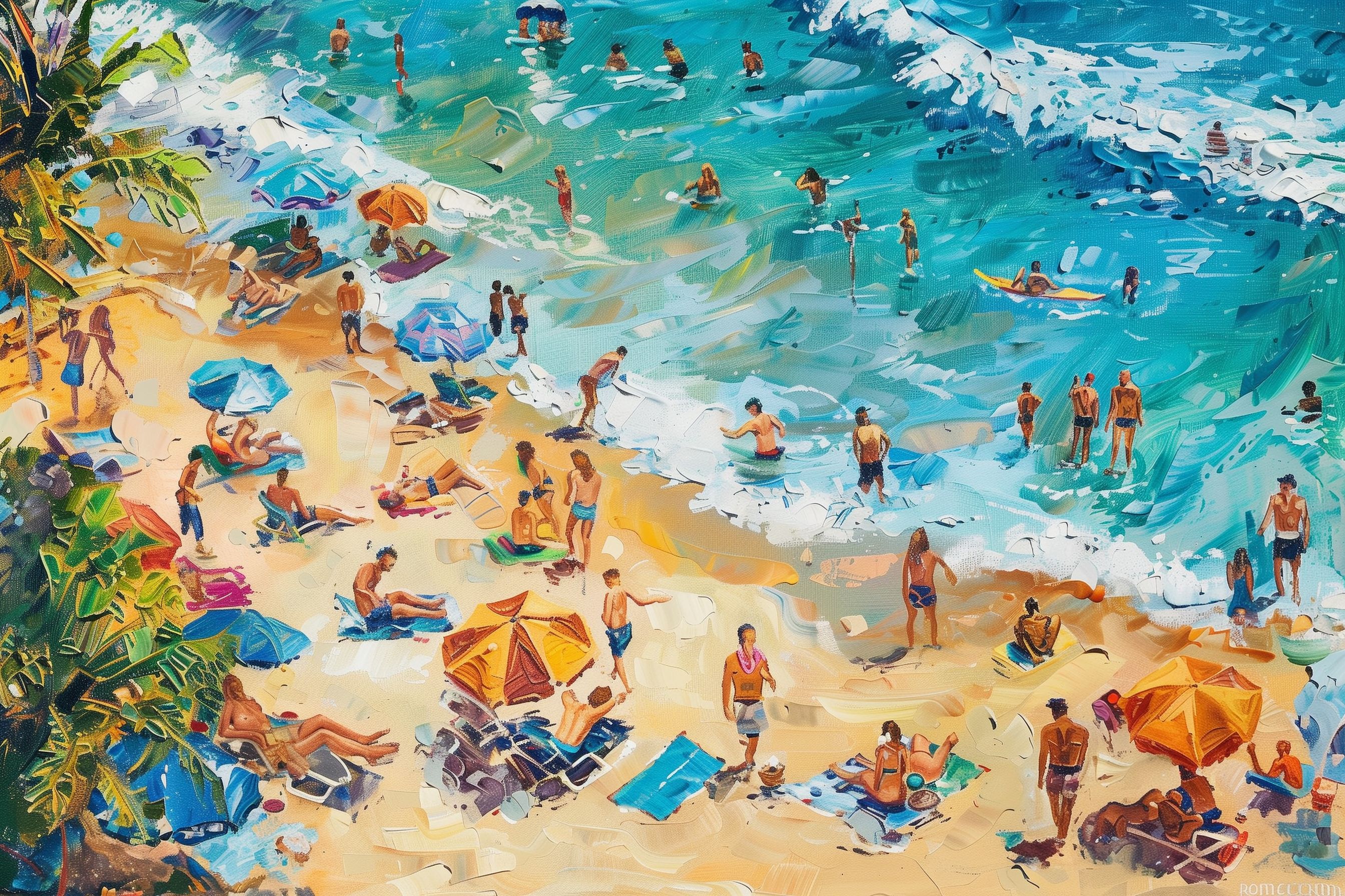 Dieses lebendige Gemälde zeigt eine farbenfrohe Strandszene mit zahlreichen Badegästen. Zu sehen sind Menschen, die sich im klaren, türkisfarbenen Wasser erfrischen, Sonnenanbeter auf dem feinen Sandstrand und Surfer, die die Wellen reiten. Bunte Sonnenschirme und Palmenwedel verleihen der Szene eine tropische Atmosphäre. Die detaillierte, expressive Malweise lässt die Lebendigkeit und Energie des Geschehens spürbar werden.