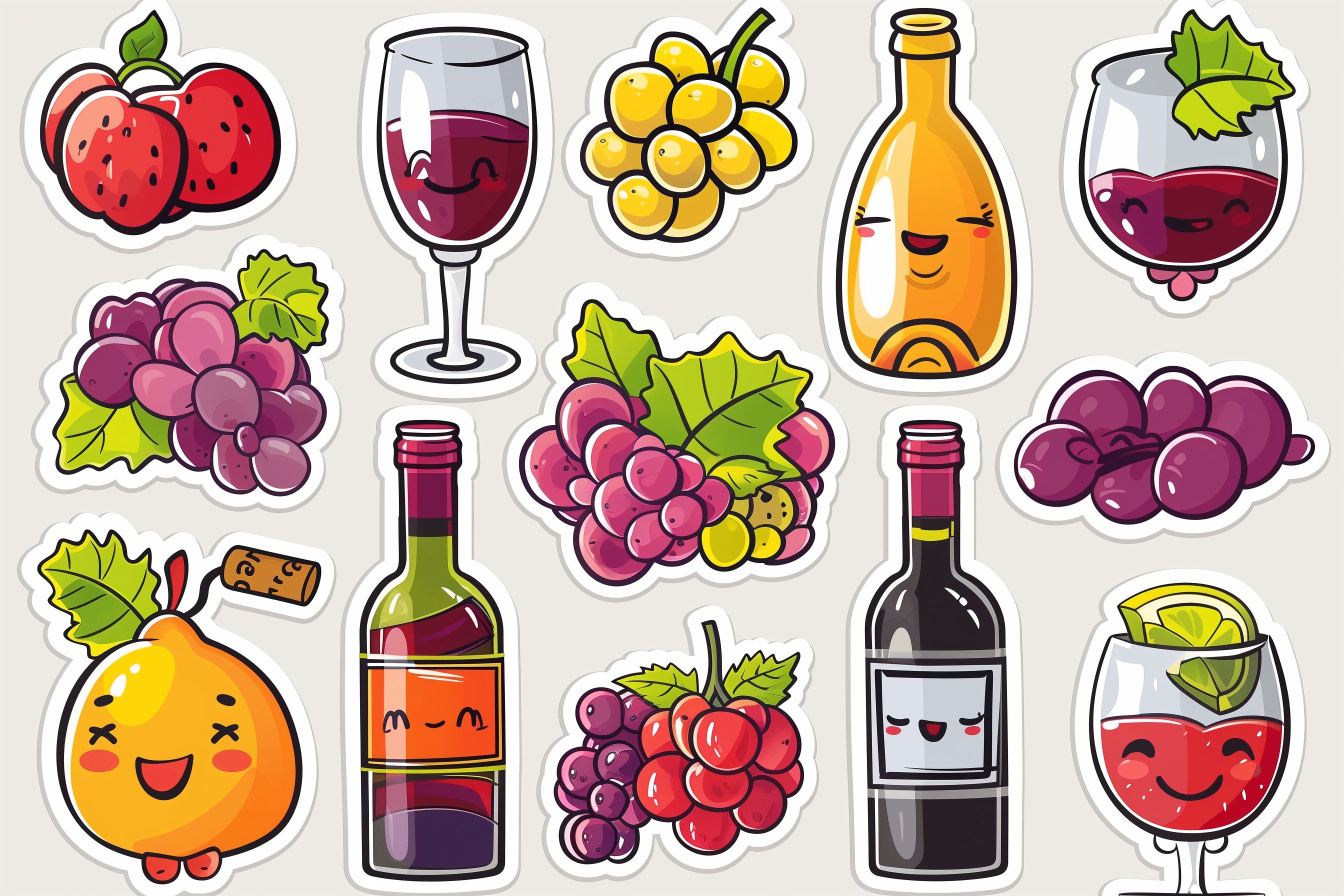 Dieses bunte Vektorgrafik-Set zeigt eine Reihe von süßen, lächelnden Weintrauben, Weinflaschen und -gläsern in einem lebendigen, kawaii-inspirierten Illustrationsstil. Die Elemente sind in kräftigen Rot-, Gelb- und Grüntönen gehalten und vermitteln eine fröhliche, appetitanregende Stimmung. Dieses hochauflösende, kostenlose Stockfoto eignet sich hervorragend für die Verwendung in Blogbeiträgen, Newslettern, Social-Media-Posts oder für Werbezwecke im Bereich Wein, Gastronomie oder Lebensmittel. Die Vektorgrafiken stehen unter einer Creative-Commons-Lizenz zur Verfügung und können flexibel eingesetzt werden.