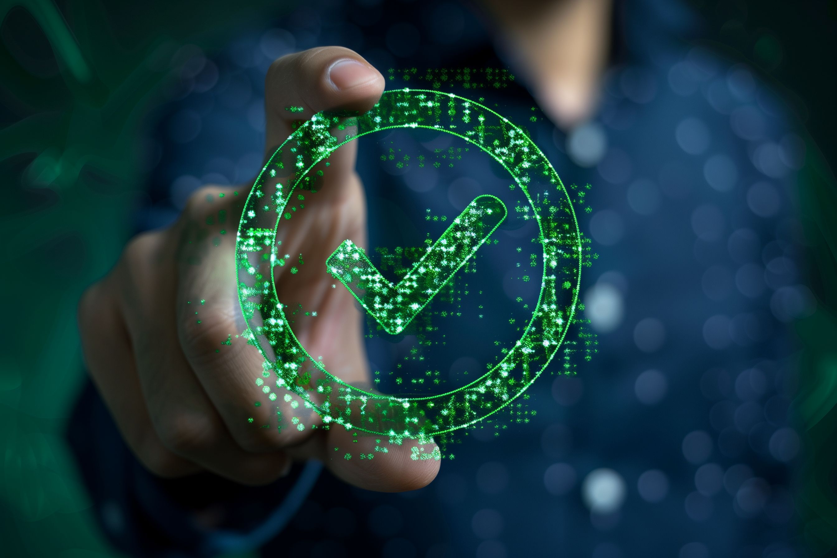 Das Bild zeigt ein grünes Häkchen-Symbol, das von funkelnden Partikeln umgeben ist. Dieses digitale Symbol signalisiert Konformität, Authentifizierung und Vertrauenswürdigkeit, etwa im Kontext von Datenschutz, Sicherheit oder Validierung. Das Foto eignet sich hervorragend für den Einsatz in Blogs, Newslettern, Werbeanzeigen oder sozialen Medien, um Themen wie Zertifizierung, Genehmigung oder Transparenz zu visualisieren. Als hochauflösendes, kostenloses Stockfoto unter Creative-Commons-Lizenz kann es frei und flexibel genutzt werden.