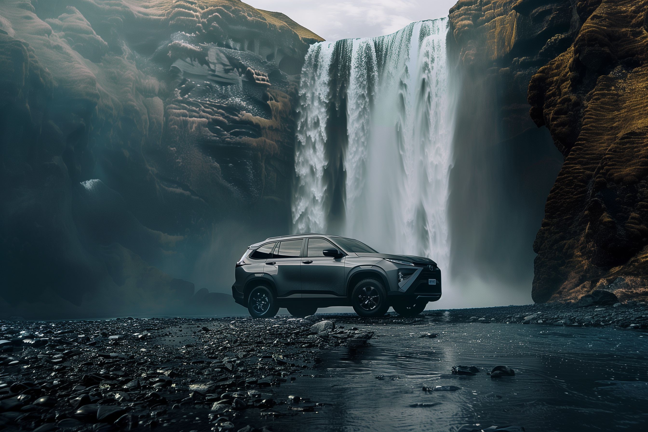 Dieses beeindruckende Bild zeigt einen eleganten, schwarzen Geländewagen vor einer majestätischen Naturkulisse. Der SUV steht inmitten eines gigantischen Wasserfalls, dessen machtvolle Strömung sich über die steil aufragenden Felsen ergießt und eine beeindruckende Szenerie schafft. Die dunkle, raue Umgebung mit den felsigen Hängen und dem tosenden Wasser bildet einen faszinierenden Kontrast zum modernen, glänzenden Fahrzeug. Dieses Stockfoto in hoher Auflösung eignet sich perfekt für den Einsatz in Blogs, Social-Media-Beiträgen oder Werbematerialien rund um Themen wie Outdoor, Abenteuer und Reisen. Es steht unter einer Creative-Commons-Lizenz zum kostenlosen Download zur Verfügung.
