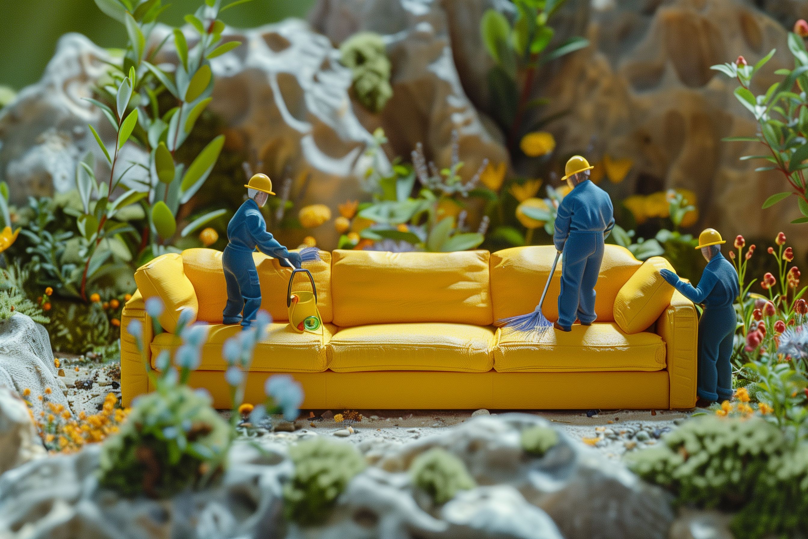Das Foto zeigt eine surreale Szene mit Miniaturarbeitern, die ein riesiges, leuchtend gelbes Sofa in einer paradiesischen Umgebung säubern. Die Arbeiter tragen blaue Overalls und sind mit Besen und Staubsaugern beschäftigt, während sie auf dem üppigen Möbelstück stehen. Im Hintergrund ist eine felsige, grüne Pflanzenwelt zu sehen, die eine tropische Atmosphäre schafft. Das Bild besticht durch seinen starken Farbkontrast und die surreale Komposition, die eine kreative und moderne Interpretation von Reinigungsszenarien darstellt. Dieses einzigartige Stockfoto eignet sich hervorragend für Blogbeiträge, Newsletter-Illustrationen oder Social-Media-Posts in den Bereichen Kunst, Kreativität oder Konzeptfotografie. Es ist in hoher Auflösung und unter einer Creative-Commons-Lizenz verfügbar.