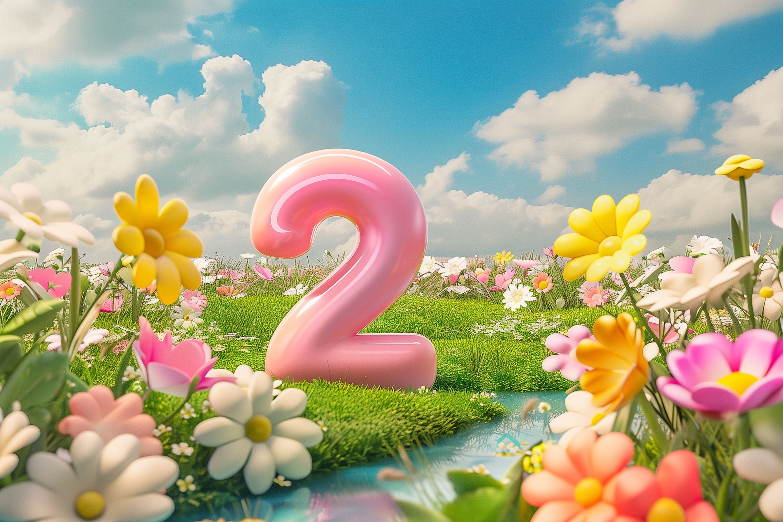 Das Bild zeigt eine bunte, idyllische Blumenwiese mit verschiedensten Blumen wie Margeriten, Löwenzahn und anderen sommerlichen Gewächsen. In der Mitte ist eine riesige, rosa Nummer '2' platziert, die an einen besonderen Anlass wie einen Geburtstag oder Jahrestag erinnern könnte. Der blaue Himmel ist mit weißen, flauschigen Wolken durchzogen, die der Szene einen verträumten, friedvollen Charakter verleihen. Dieses fantasievolle Motiv eignet sich hervorragend als Hintergrund für Blogbeiträge, Social-Media-Posts oder Werbeanzeigen mit einem frühlingshaften, fröhlichen Thema. Als hochauflösendes, kostenloses Stockfoto unter Creative-Commons-Lizenz ist es vielseitig einsetzbar.
