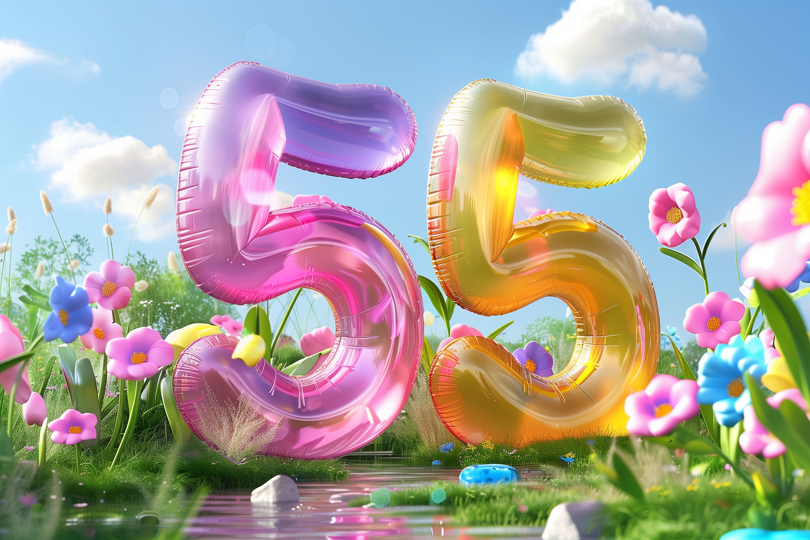 Dieses farbenfrohe Stockfoto zeigt eine sommerliche Blumenwiese mit rosafarbenen und gelben Luftballons in Form der Zahl 55. Die Ballons schweben über der idyllischen Landschaft mit bunten Blumen und einem blauen Himmel mit weißen Wolken. Das Bild strahlt Freude und Leichtigkeit aus und eignet sich hervorragend für die Gestaltung von Geburtstags-, Jubiläums- oder Partydekorationen. Als hochauflösendes, kostenloses Stockfoto unter der Creative-Commons-Lizenz kann es vielseitig in Blogs, Newslettern, sozialen Medien oder Werbematerialien eingesetzt werden.
