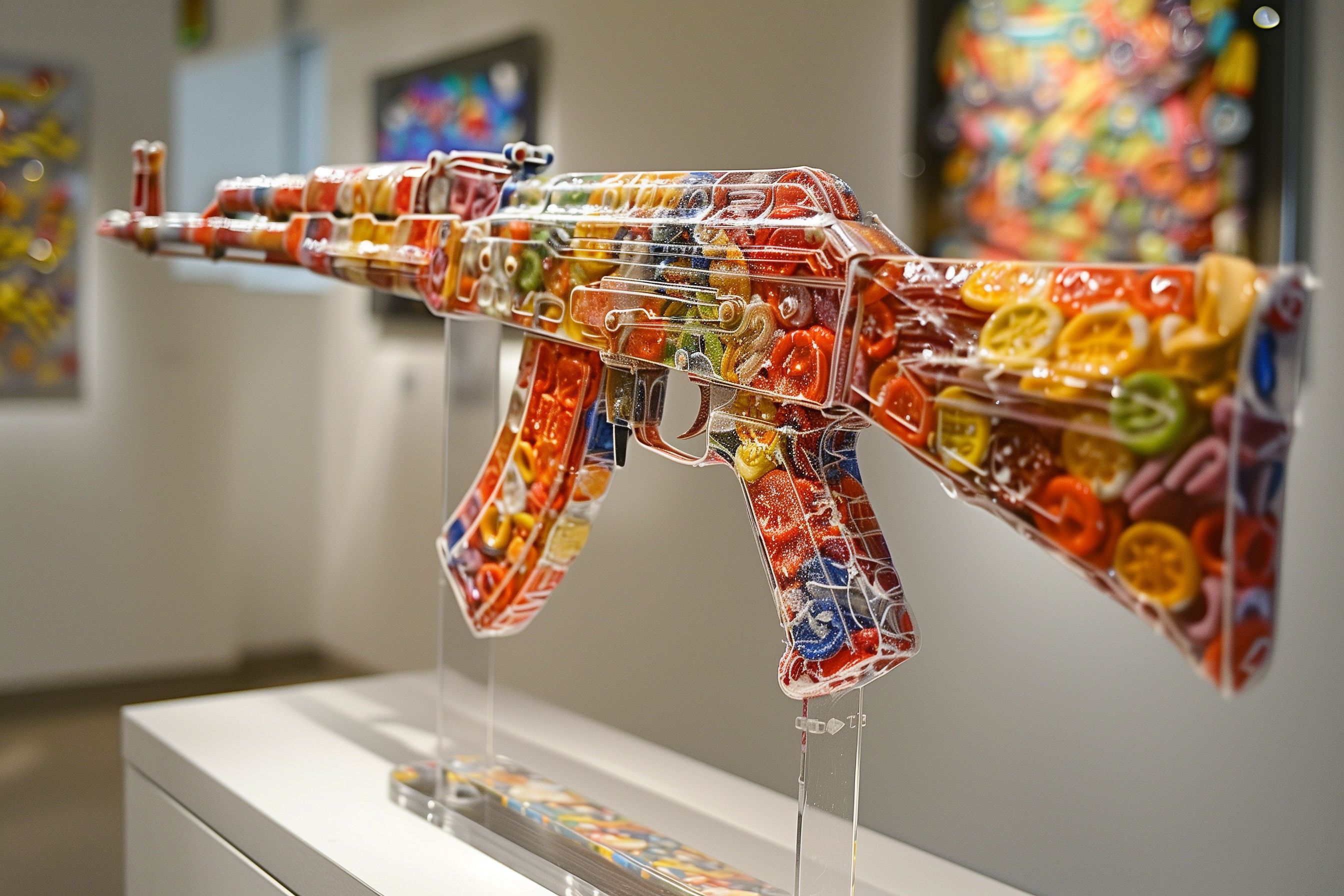 Das Bild zeigt eine kunstvoll gestaltete Interpretation einer Spielzeugwaffe, die aus verschiedenen bunten Süßigkeiten zusammengesetzt ist. Die Waffe ist in einer Vitrine ausgestellt, sodass die Details und Farbkombinationen gut zu erkennen sind. Das Kunstwerk spiegelt eine kindliche Sichtweise wider und steht im Kontrast zu der üblichen Darstellung von Feuerwaffen. Es handelt sich um ein kreatives, originelles Foto, das sich hervorragend für den Einsatz in Blogs, Newslettern oder sozialen Medien eignet - etwa im Kontext von Kreativität, Kindheit oder unkonventioneller Kunst. Dieses hochauflösende Stockfoto ist unter einer Creative Commons-Lizenz frei verwendbar.