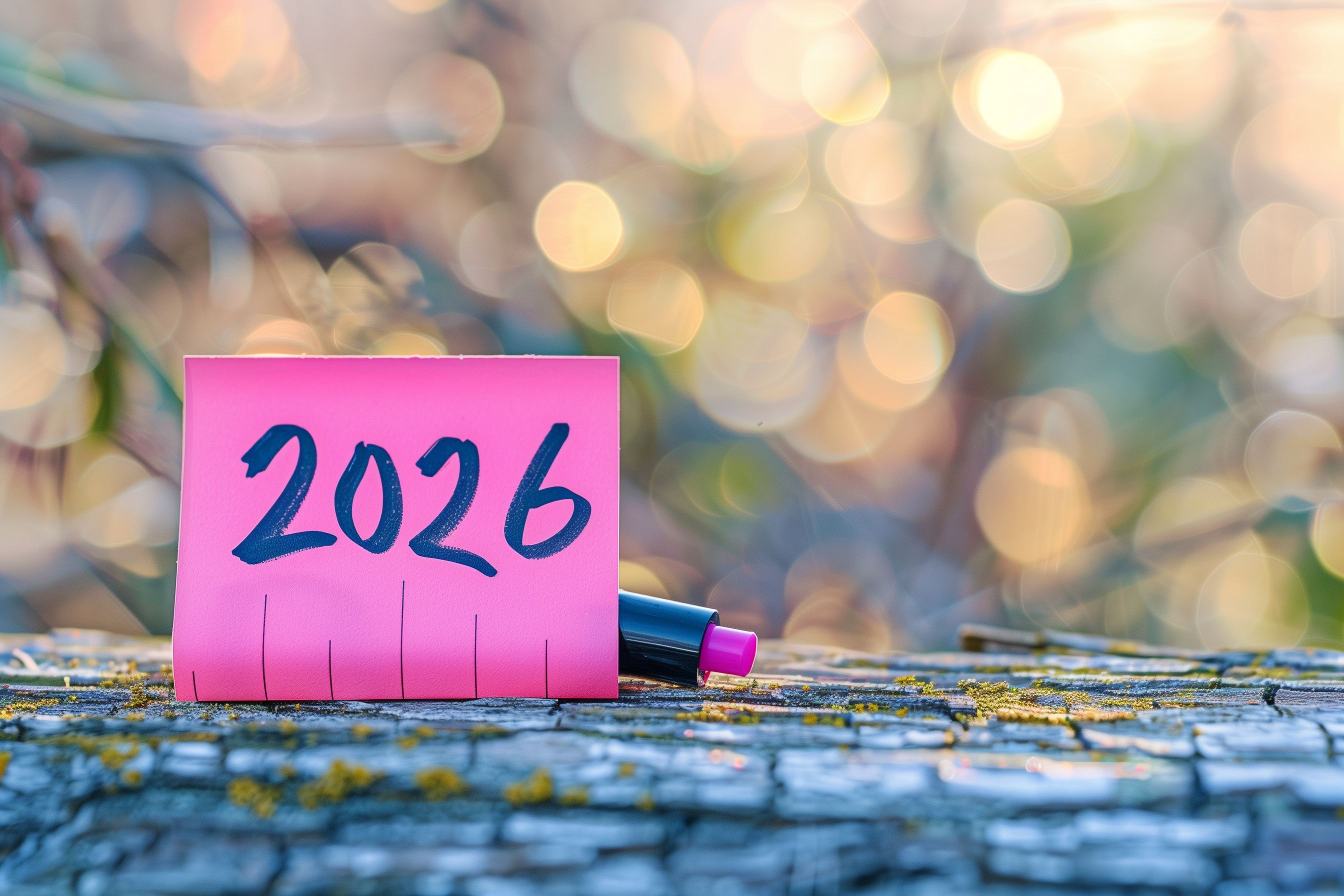 Das Bild zeigt eine rosa Notiz mit der Aufschrift '2026' auf einem rustikalen, moosbedeckten Holzboden. Im Hintergrund sind verschwommene Lichtspiele und Bokeh-Effekte zu sehen, die eine stimmungsvolle, festliche Atmosphäre vermitteln. Die Komposition lenkt den Blick direkt auf das Jahresende und die anstehenden Neujahrsvorsätze und Ziele für 2026. Dieses kostenlose, hochauflösende Stockfoto eignet sich hervorragend für Blogbeiträge, Newslettergestaltung, Social-Media-Posts oder Werbematerialien rund um das Thema Jahreswechsel, Vorsätze und neue Pläne.