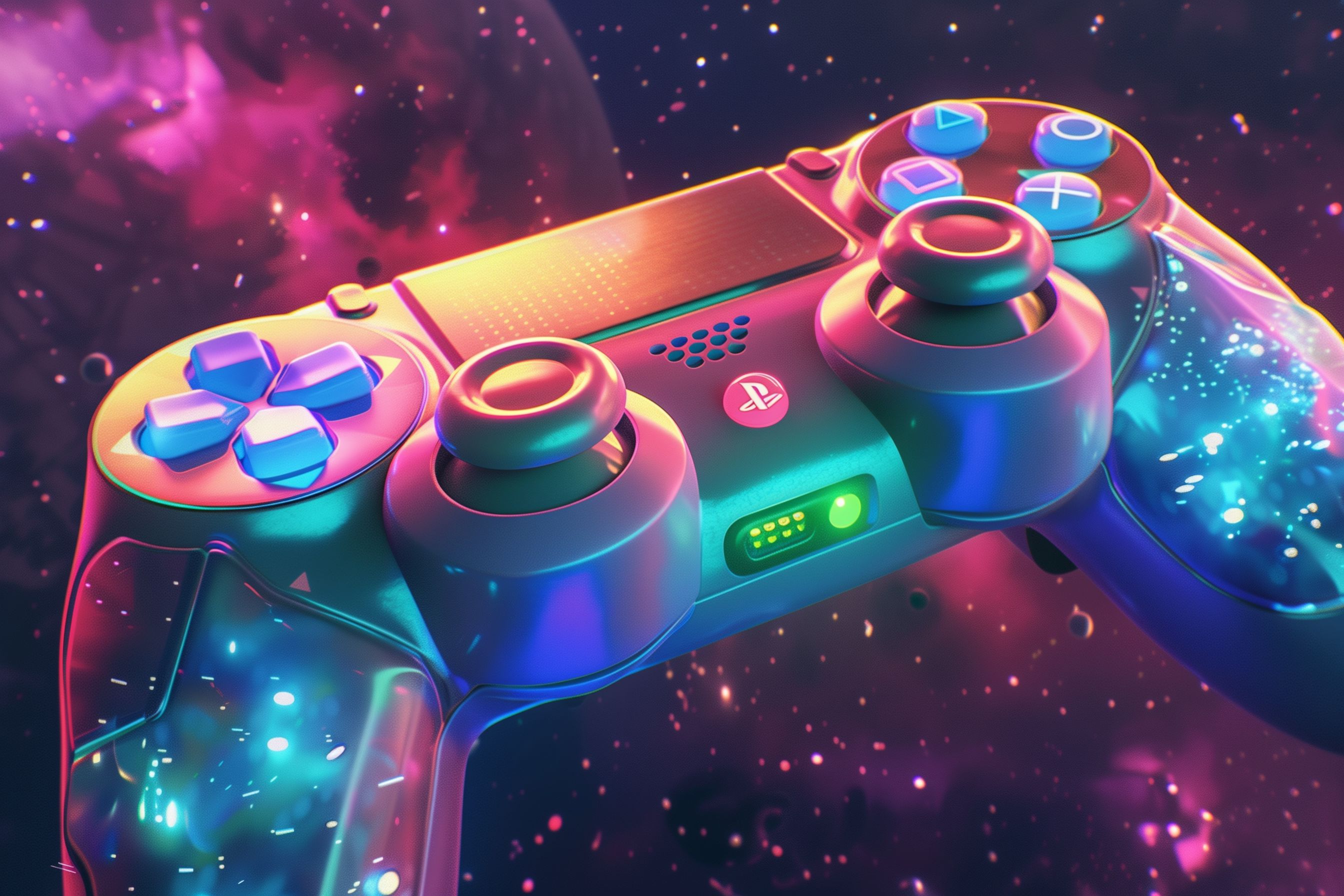 Das Bild zeigt einen futuristisch gestalteten Videospielercontroller in leuchtendem Design. Die Oberfläche des Controllers ist mit farbigen Tasten, Knöpfen und Griffen versehen, die in einem satten Farbspektrum von Blau, Rot, Gelb und Violett strahlen. Der Hintergrund ist von kosmischen Nebelstrukturen, Sternen und schwebenden Partikeln in dunklen Tönen umgeben, die dem Bild einen mystisch-surrealen Charakter verleihen. Dieses Stockfoto eignet sich hervorragend für Veröffentlichungen im Bereich Gaming, Digitaltechnik, Unterhaltung sowie für kreative Gestaltungen in hoher Auflösung und unter einer Creative-Commons-Lizenz.