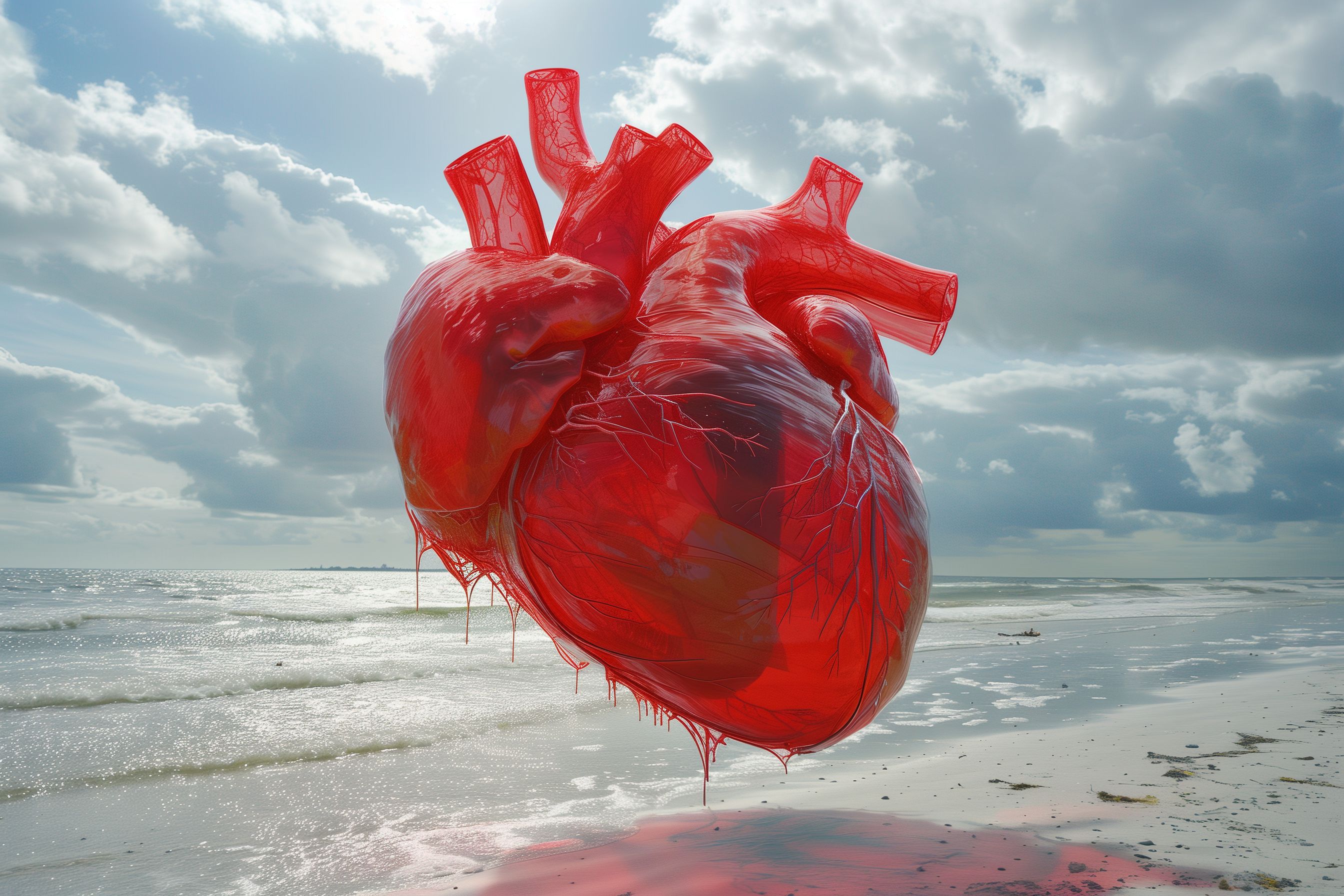 Das Bild zeigt ein detailliertes, surreal wirkendes rotes Herz, das über einer Meereslandschaft mit Wolken schwebt. Das Herz ist sehr realistisch dargestellt, mit plastischen Gefäßstrukturen und Schattenwurf. Der Kontrast zwischen dem organischen Herzmotiv und der natürlichen Umgebung erzeugt eine faszinierende, symbolische Wirkung. Das Foto eignet sich hervorragend für den Einsatz in Magazinen, Blogbeiträgen oder Werbekampagnen zu Themen wie Gesundheit, Medizin, Anatomie oder Emotionen. Als hochauflösendes Stockfoto unter Creative-Commons-Lizenz ist es für vielfältige Zwecke frei nutzbar.