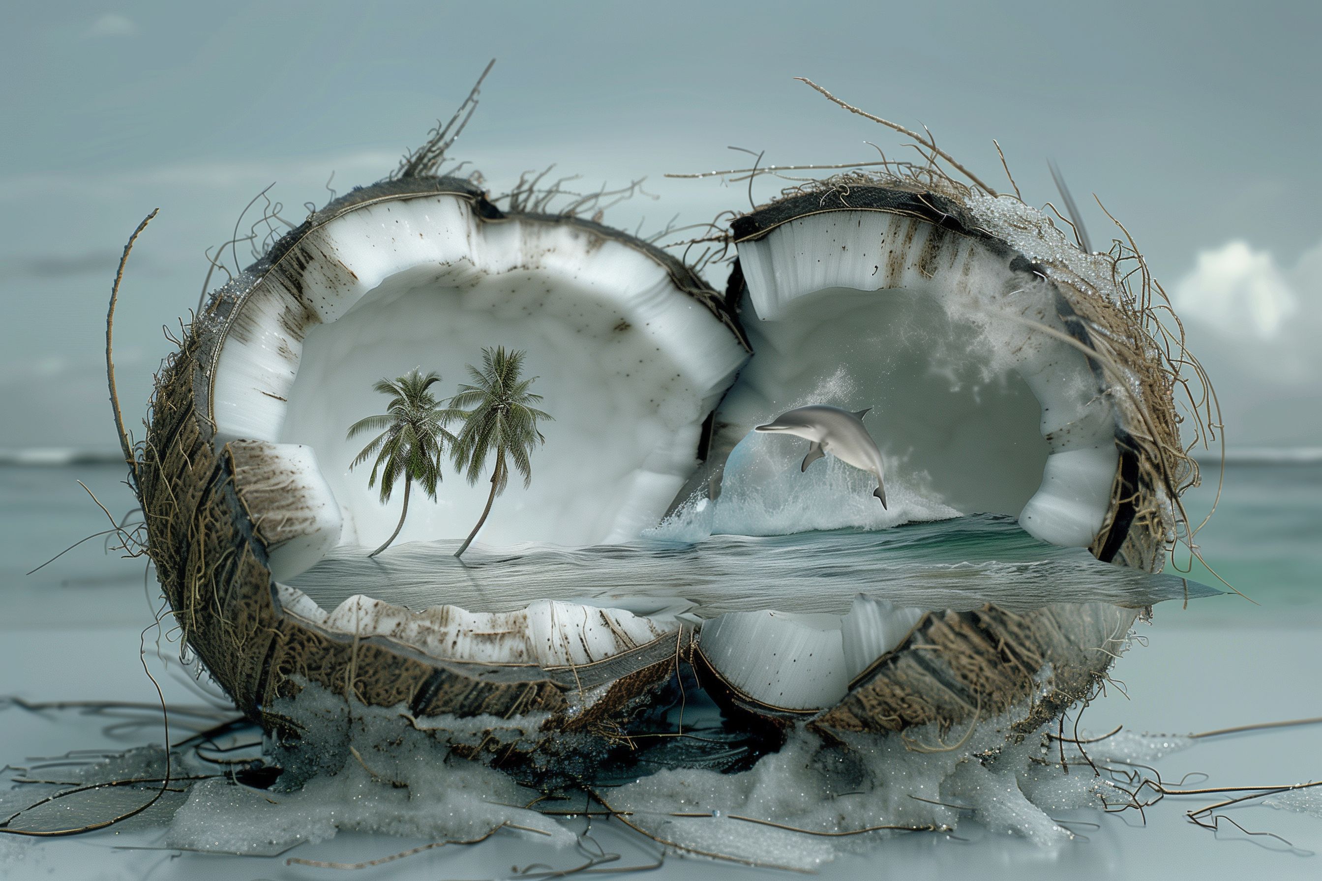Dieses kreative Stockfoto zeigt eine surreal anmutende Szene in einer Kokosnuss. Im Inneren ist eine miniaturartige Insellandschaft mit Palmen und einem Delfin im Meer zu sehen. Der 3D-Effekt und die ruhige, tropische Stimmung machen das Bild zu einem idealen Hintergrund für Werbung, Social-Media-Posts oder Blogbeiträge rund um Themen wie Urlaub, Reisen, Sommerferien und Entspannung. Dieses hochauflösende, lizenzfreie Foto ist unter Creative-Commons-Bedingungen kostenlos für private und kommerzielle Zwecke nutzbar.
