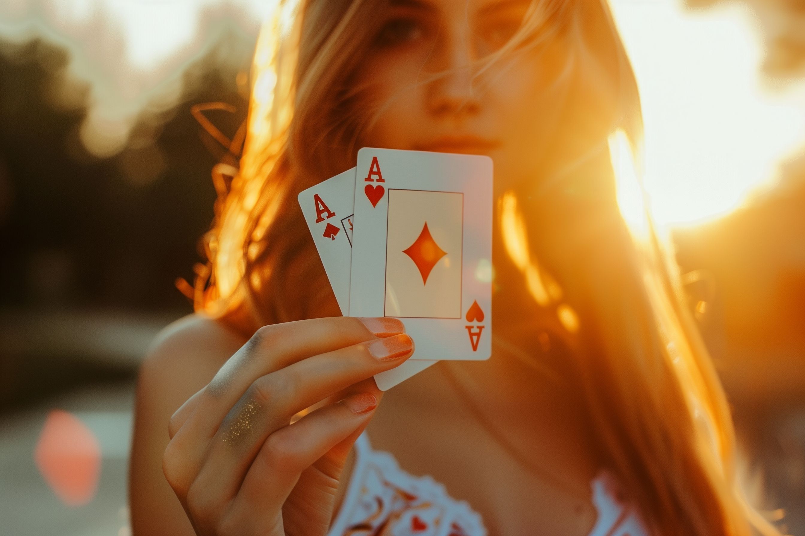 Das Foto zeigt eine junge Frau, die zwei Spielkarten - die Asse von Herz und Karo - in der Hand hält, vor einem stimmungsvollen Sonnenuntergangshintergrund. Das warme, goldene Licht taucht die Szene in eine mystische, fast schon geheimnisvolle Atmosphäre. Die Komposition lenkt den Blick direkt auf die Spielkarten, die von der Frau fest umschlossen werden, als würde sie ihre Glückschancen prüfen.