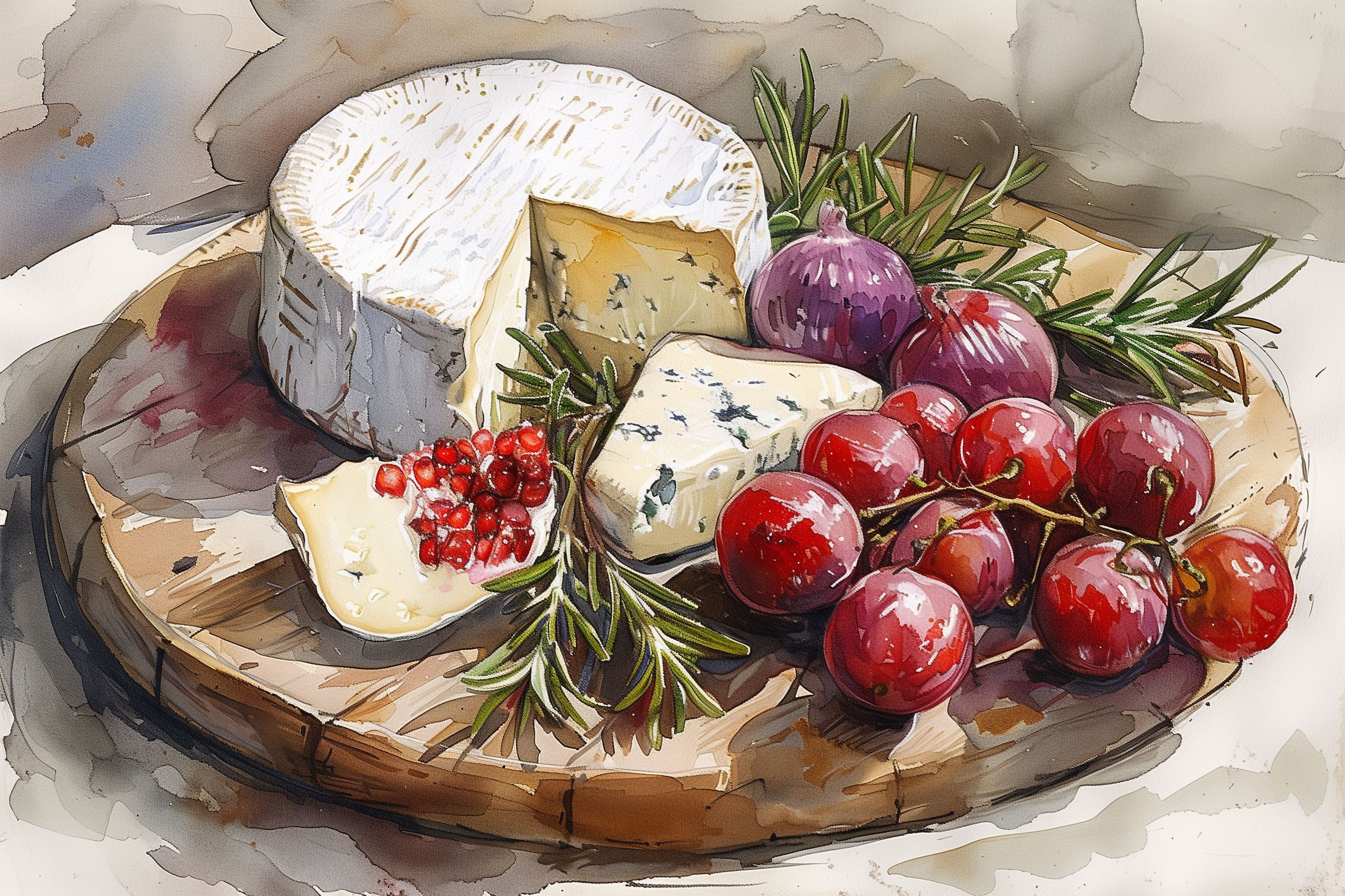 Dieses liebevoll illustrierte Stillleben zeigt eine köstliche Käseplatte, die mit reifen Trauben, würzigem Rosmarin und einem Hauch von Eleganz arrangiert wurde. Die detailreiche, aquarellhafte Darstellung verleiht dem Bild eine natürliche, einladende Ausstrahlung, die sich perfekt für die Verwendung in Rezepten, auf Foodblogs oder in sozialen Medien eignet. Hochauflösend und unter einer Creative-Commons-Lizenz verfügbar, kann dieses Stockfoto vielfältig eingesetzt werden - ob für Werbekampagnen, Menüvorstellungen oder die Gestaltung von Newslettern. Die stimmungsvolle Farbgebung und das kunstvolle Arrangement machen das Bild zu einem echten Hingucker, der Appetit auf mehr weckt.