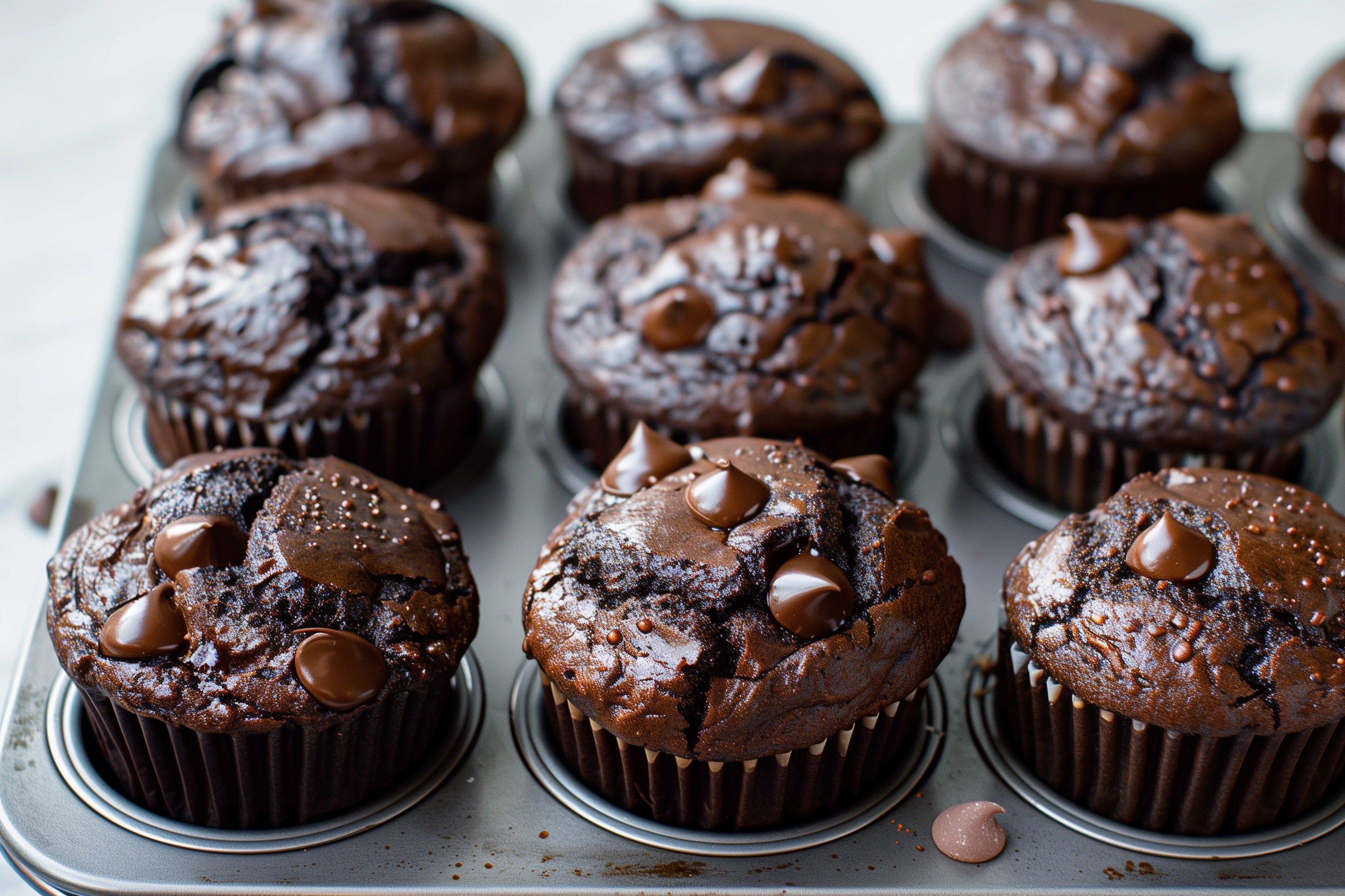 Das Bild zeigt eine Auswahl von leckeren, selbstgebackenen Schokoladen-Muffins, die in Backförmchen serviert werden. Die Muffins haben eine dunkelbraune, glänzende Oberfläche und sind mit Schokostückchen garniert. Sie sehen verführerisch und appetitlich aus. Dieses hochwertige Stockfoto in hoher Auflösung eignet sich hervorragend für den Einsatz in Blogs, Newslettern, Social-Media-Kanälen oder Werbeanzeigen rund um das Thema Backen, Desserts und Leckereien. Das Foto steht unter einer Creative-Commons-Lizenz zur kostenlosen Verwendung zur Verfügung.