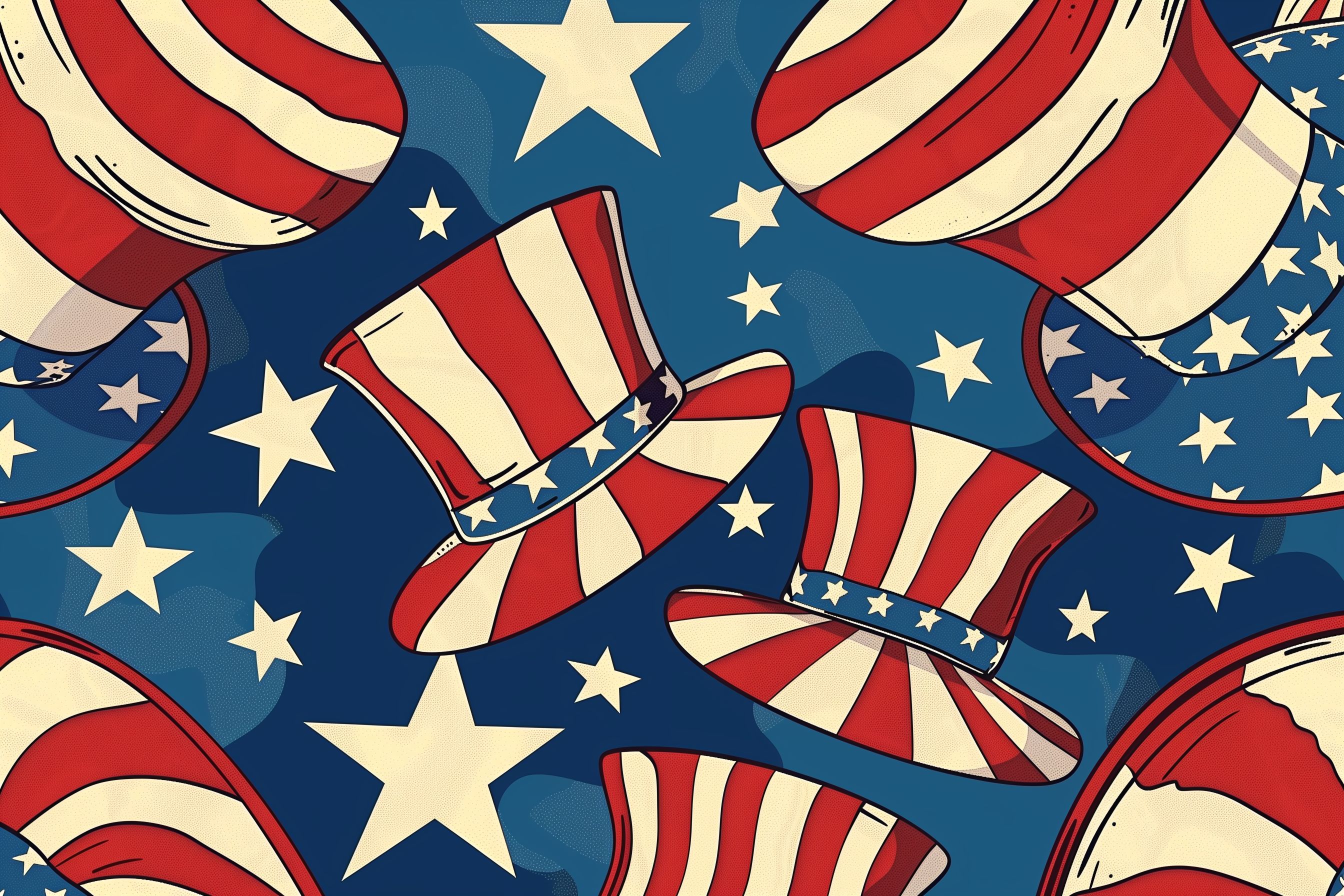 Das Bild zeigt ein patriotisches Muster in den Farben Rot, Weiß und Blau. Es sind verschiedene Symbole der amerikanischen Flagge zu sehen, wie Sterne, Streifen und typische Zylinderhüte. Das Motiv hat einen illustrativen, vintage-artigen Stil mit einer lebendigen, expressiven Gestaltung. Es vermittelt ein Gefühl von Stolz, Feiern und Unabhängigkeit.