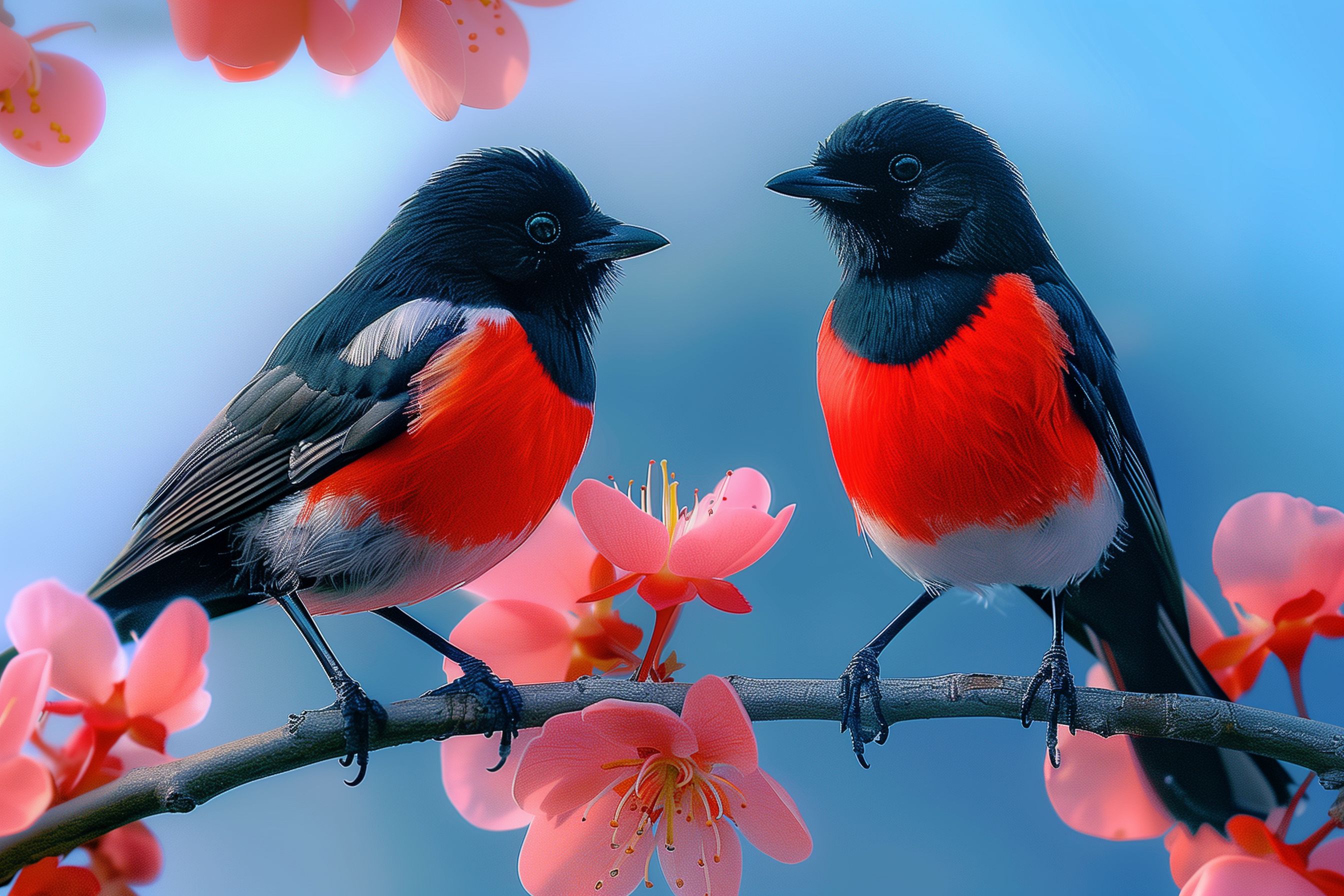 Dieses wunderschöne Foto zeigt zwei Vögel mit kontrastreichem Gefieder auf einem blühenden Zweig. Die schwarzen Elstern mit ihren leuchtend roten Brustfedern bilden einen faszinierenden Kontrast zu den rosafarbenen Blüten im Hintergrund. Die scharfe Fokussierung und die lebendige Farbgebung verleihen dem Bild eine fast märchenhafte Anmutung. Es eignet sich hervorragend als kostenloses Stockfoto für Blogs, Newsletter, Social Media-Beiträge oder andere kreative Projekte in hoher Auflösung und unter der Creative Commons-Lizenz.