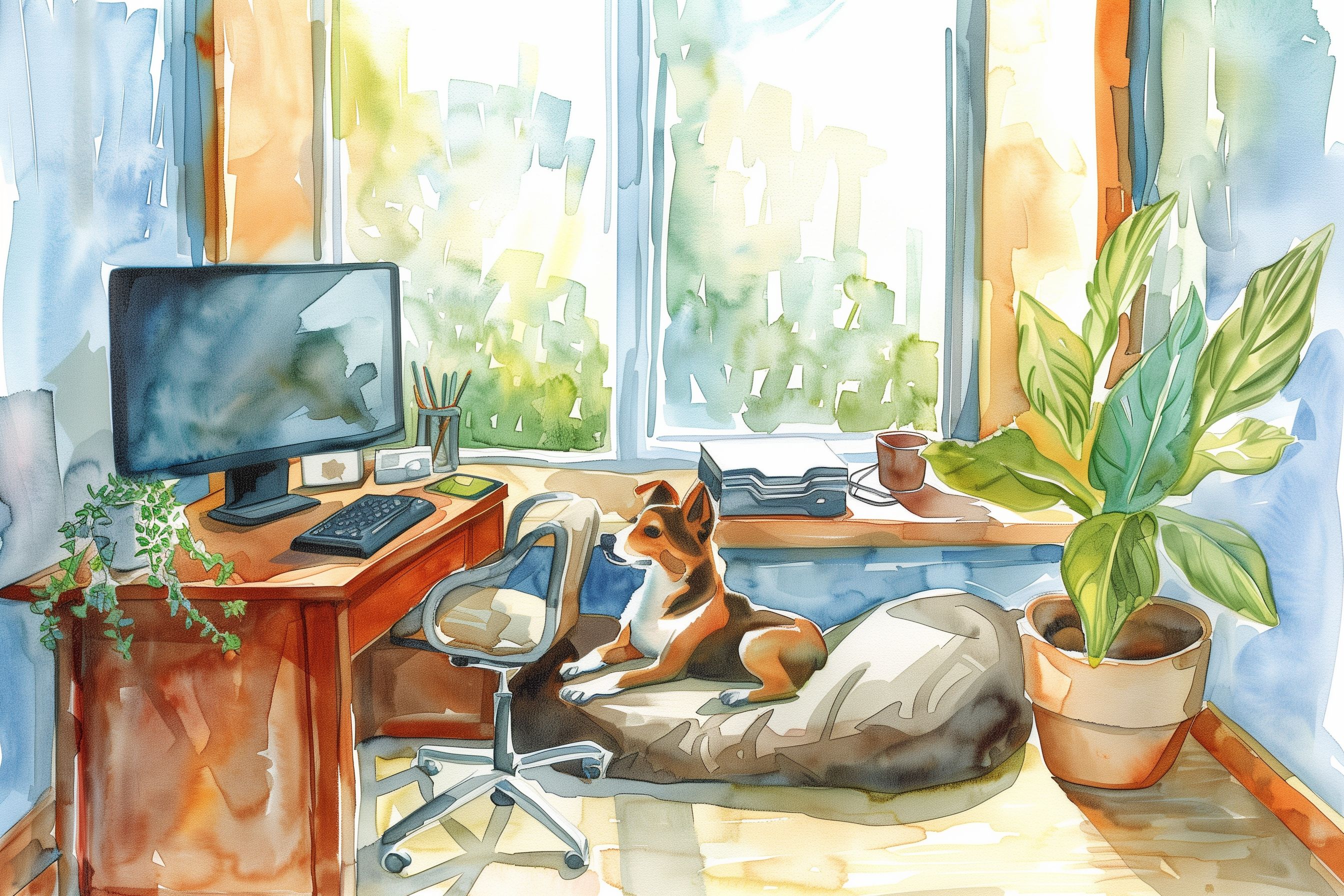 Die Illustration zeigt ein gemütliches Heimarbeitszimmer mit Blick auf eine grüne, idyllische Landschaft. Der Raum ist mit einem Computer-Arbeitsplatz, Zimmerpflanzen und einem entspannt auf dem Bürostuhl sitzenden Hund ausgestattet. Die Aquarellfarben erzeugen eine stimmungsvolle und ruhige Atmosphäre, die Inspiration und Konzentration beim Arbeiten vermittelt. Dieses kostenlose Stockfoto in hoher Auflösung unter Creative-Commons-Lizenz eignet sich hervorragend für Blogs, Newsletter, Social-Media-Beiträge und Werbung, um eine gemütliche, produktive Arbeitsstimmung zu vermitteln.