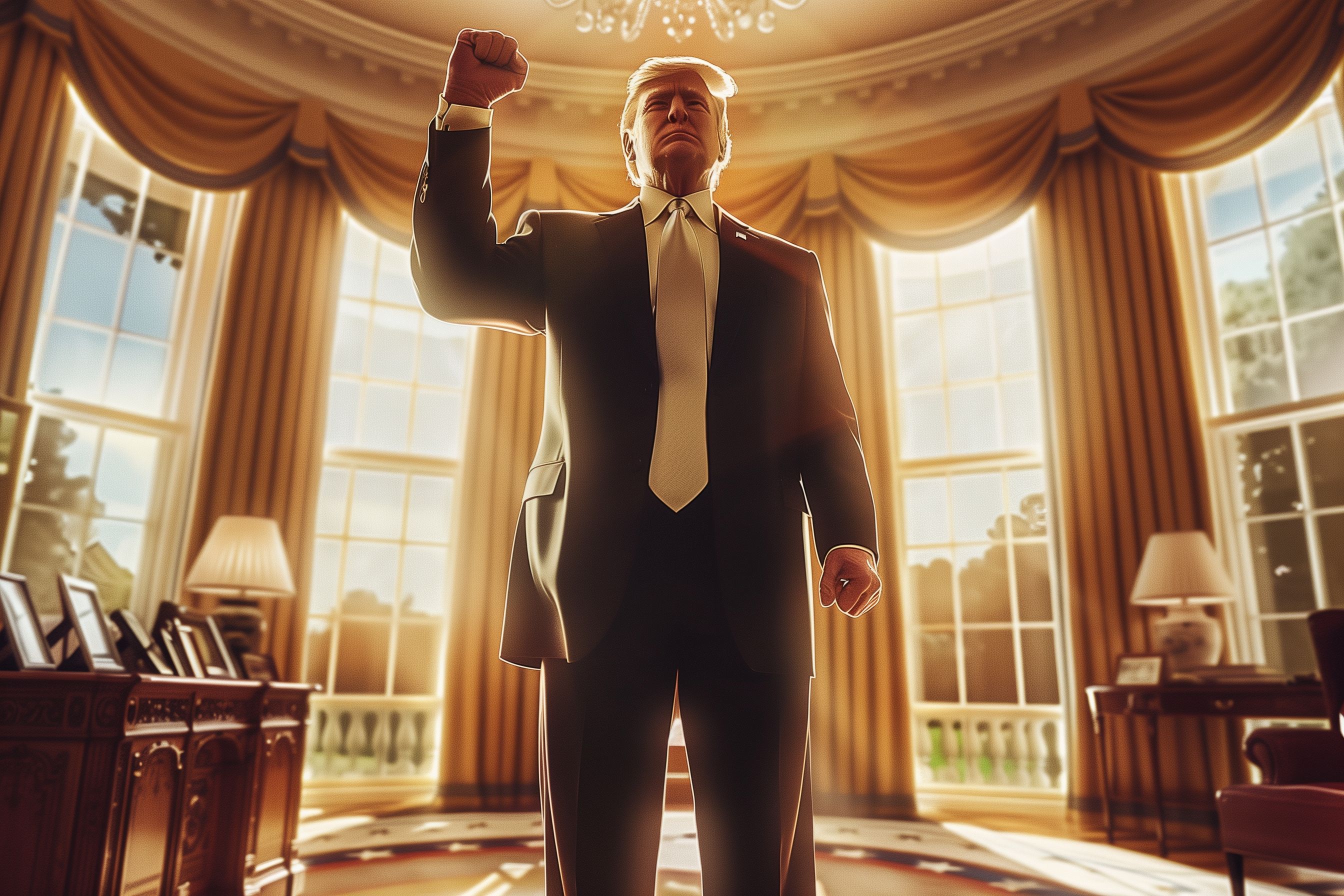 Das Bild zeigt eine Führungsfigur, die entschlossen im Oval Office steht, dem Arbeitszimmer des Präsidenten der Vereinigten Staaten. Die Person trägt einen dunklen Anzug mit Krawatte und hat die Faust erhoben, was Stärke und Entschlossenheit ausstrahlt. Der luxuriöse Innenraum mit seinen goldenen Verzierungen, Vorhängen und großen Fenstern verleiht dem Bild eine historische Aura und unterstreicht den Eindruck von Macht und Einfluss.
