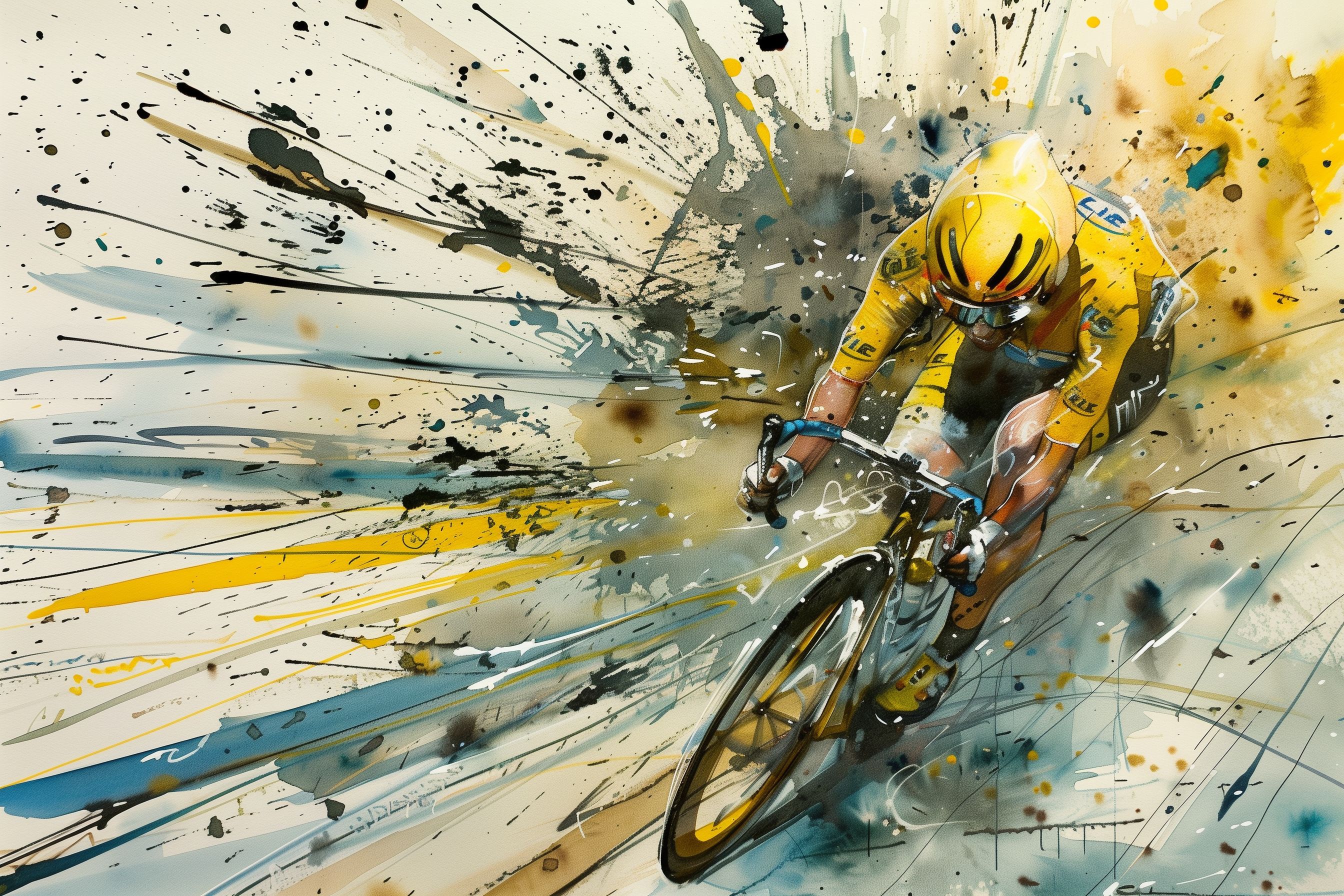 Das Bild zeigt einen dynamischen Radrennsport-Athleten in voller Fahrt. Mit großer Geschwindigkeit rast der Radfahrer durch die Landschaft, umgeben von bunten Farbspritzern, die seine Bewegung betonen und dem Bild eine expressiv-abstrakte Note verleihen. Die kräftige Körperhaltung des Athleten und die Unschärfe der Szene vermitteln eine Atmosphäre intensiver Anstrengung und Konzentration. Dieses Stockfoto in hoher Auflösung eignet sich hervorragend für die Verwendung in Blogbeiträgen, Newslettern, Social-Media-Kampagnen oder Werbematerialien zum Thema Sport, Wettkampf und Bewegung. Es steht unter einer Creative-Commons-Lizenz kostenfrei zur Verfügung.