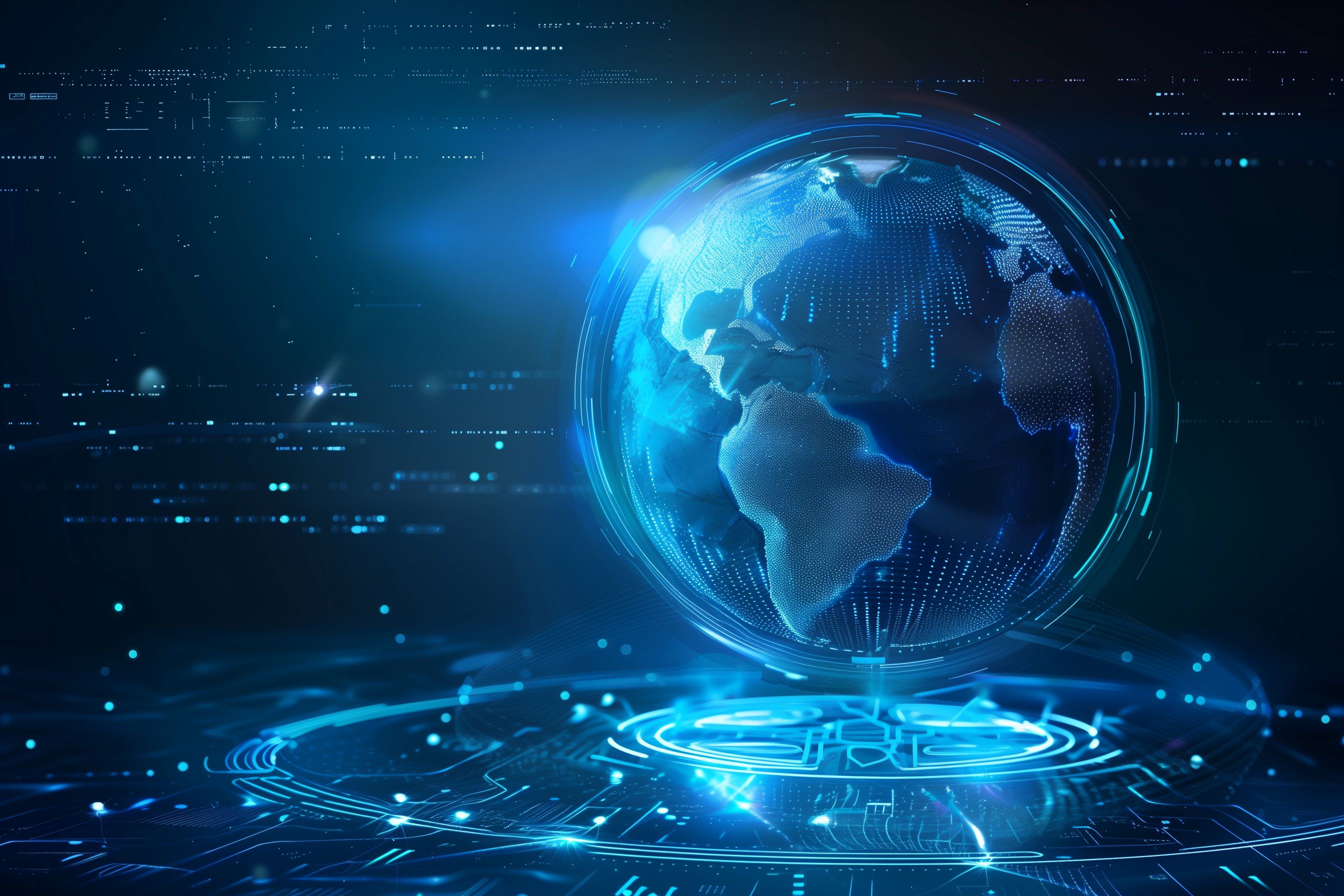 Das Bild zeigt eine digitale Weltkugel, die von einem futuristischen Technologienetz umgeben ist. Die blaue Farbgebung und die leuchtenden Linien vermitteln einen modernen, hochtechnologischen Eindruck. Die Darstellung symbolisiert die globale Vernetzung und den Fortschritt in der Informationstechnologie. Dieses Stockfoto eignet sich hervorragend für Anwendungen in Bereichen wie Wissenschaft, Forschung, IT, Kommunikation und Geschäftskonzepte. Es ist in hoher Auflösung verfügbar und kann unter den Bedingungen der Creative Commons-Lizenz kostenfrei genutzt werden.