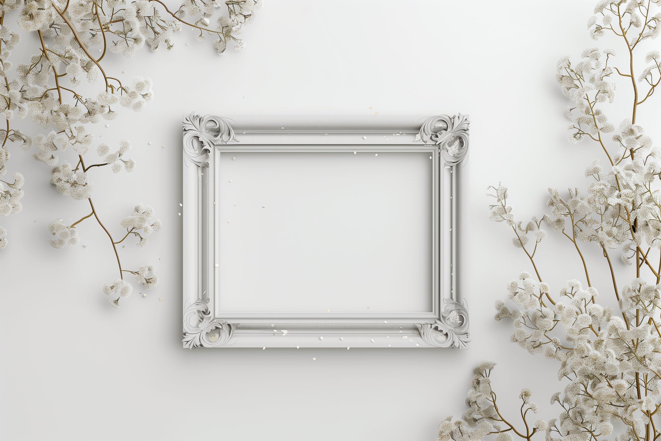 Dieses elegante Foto zeigt einen ornamental verzierten Bilderrahmen, der von zarten weißen Blüten und Zweigen umrahmt ist. Die Komposition wirkt sehr harmonisch und hochwertig, als würde der Rahmen eine besondere Aufnahme oder Grafik perfekt in Szene setzen. Dieses Motiv eignet sich hervorragend als Hintergrund für Hochzeitsankündigungen, Blog-Beiträge zum Thema Frühling oder Dekor-Ideen. Das hochauflösende Stockfoto steht unter der Creative-Commons-Lizenz kostenlos zum Download zur Verfügung.