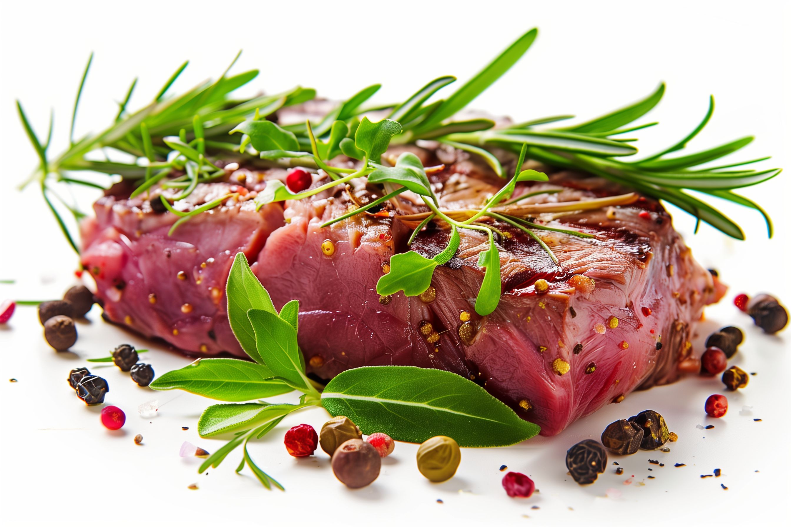 Das Bild zeigt ein saftiges, rosa Rindersteak, garniert mit einer Vielzahl an frischen Kräutern und Gewürzen. Die Fleischoberfläche ist mit Pfeffer- und Rosmarinkörnern bestreut, was dem Gericht eine appetitliche Optik verleiht. Die Komposition im Hochformat und die detaillierte Nahaufnahme lenken die Aufmerksamkeit direkt auf das Hauptmotiv - das leckere Steak. Diese Aufnahme eignet sich hervorragend als kostenloses Stockfoto für Rezept-Blogs, Foodportale oder Werbematerialien rund um kulinarische Themen. Das hochauflösende Bild ist unter einer Creative Commons-Lizenz verfügbar und kann vielfältig in digitalen Medien eingesetzt werden.
