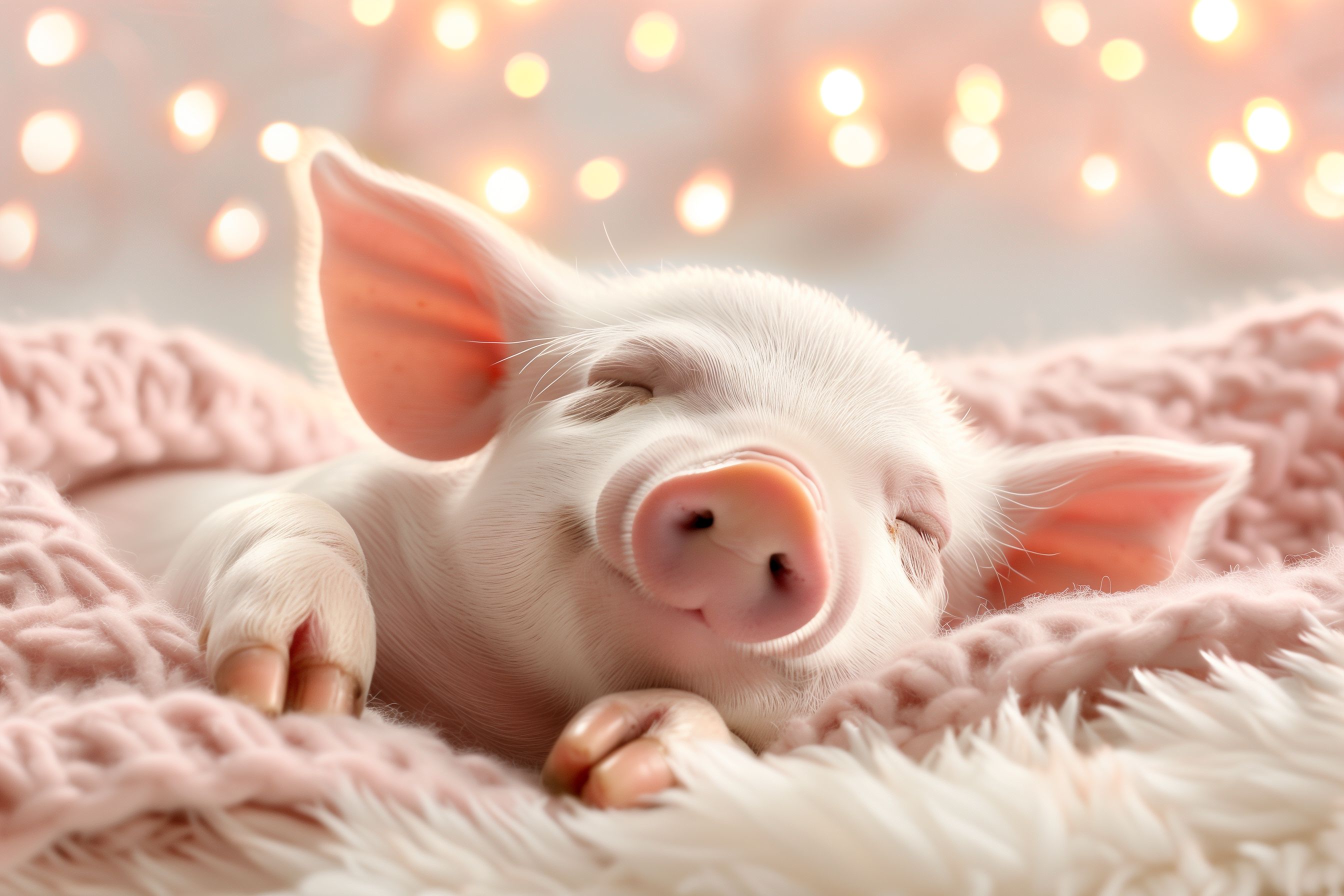 Dieses zuckersüße Foto zeigt ein schlafendes Schweinchen auf einem flauschigen, rosa Untergrund. Mit seinen geschlossenen Äuglein und der entspannten Körperhaltung sieht das Ferkel richtig friedlich und verträumt aus. Der Hintergrund ist mit gemütlichen Lichtpunkten versehen, die eine wohlige, weihnachtliche Stimmung vermitteln. Dieses Stockfoto in hoher Auflösung eignet sich perfekt für saisonale, weihnachtliche Designs, Blogbeiträge, Social-Media-Posts oder auch als kostenlose Hintergrundgrafik.