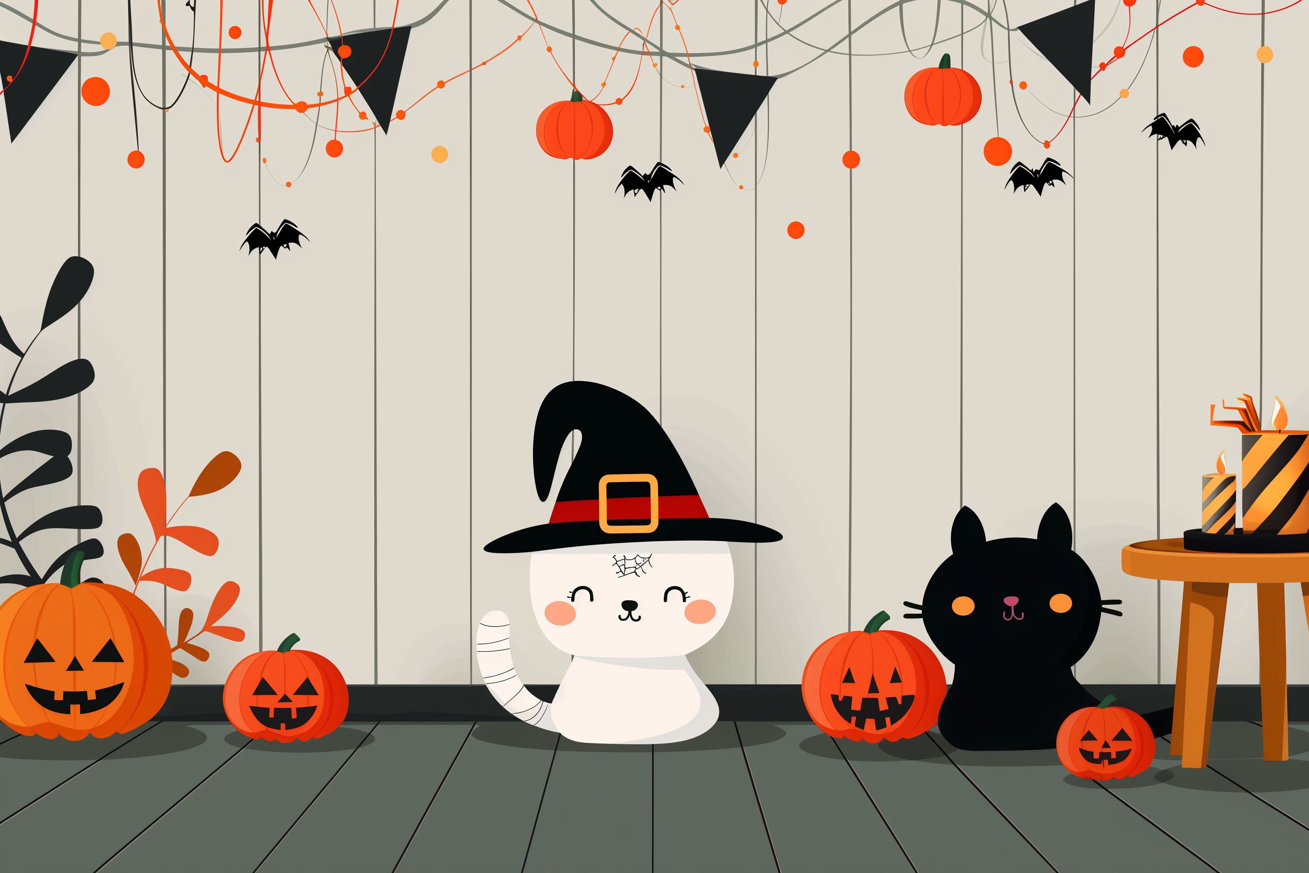Diese niedliche Halloween-Illustration zeigt eine bunte Szene mit verschiedenen herbstlichen Dekorationen. Im Vordergrund sitzen zwei Katzen, eine weiße Katze mit Hexenhut und eine schwarze Katze. Sie sind umgeben von Kürbissen in unterschiedlichen Formen und Größen sowie Fledermäusen, die an Fäden von der Decke hängen. Weitere Details sind Blätter, Lichter und Geschenkboxen. Die Illustration hat einen verspielten, handgezeichneten Stil in Rot, Orange und Schwarz auf hellem Hintergrund.