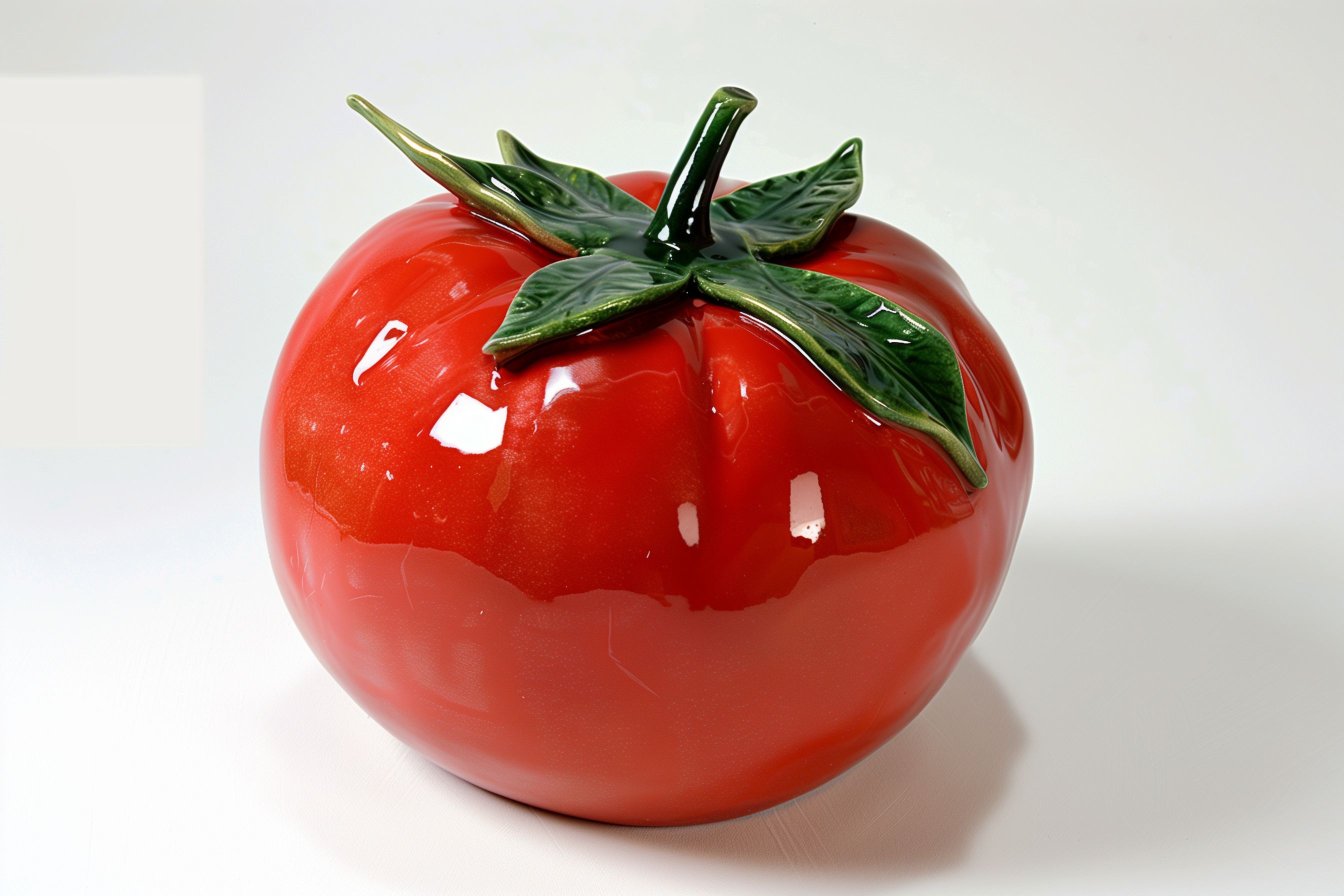 Dieses Foto zeigt eine detaillierte Aufnahme einer glänzenden, leuchtend roten Keramiktomate. Die Tomate ist vor einem einfarbigen, weißen Hintergrund platziert, wodurch die Farbe und Form besonders hervorgehoben werden. Die grünen Blätter am Stiel verleihen dem Motiv einen natürlichen Akzent. Diese hochauflösende Fotografie eignet sich hervorragend als Stockfoto für Blogbeiträge, Newsletter, Social-Media-Posts oder Werbematerial rund um Themen wie gesunde Ernährung, Küchendekoration oder kulinarische Inspiration. Das Bild steht unter einer Creative-Commons-Lizenz zur freien Nutzung zur Verfügung.