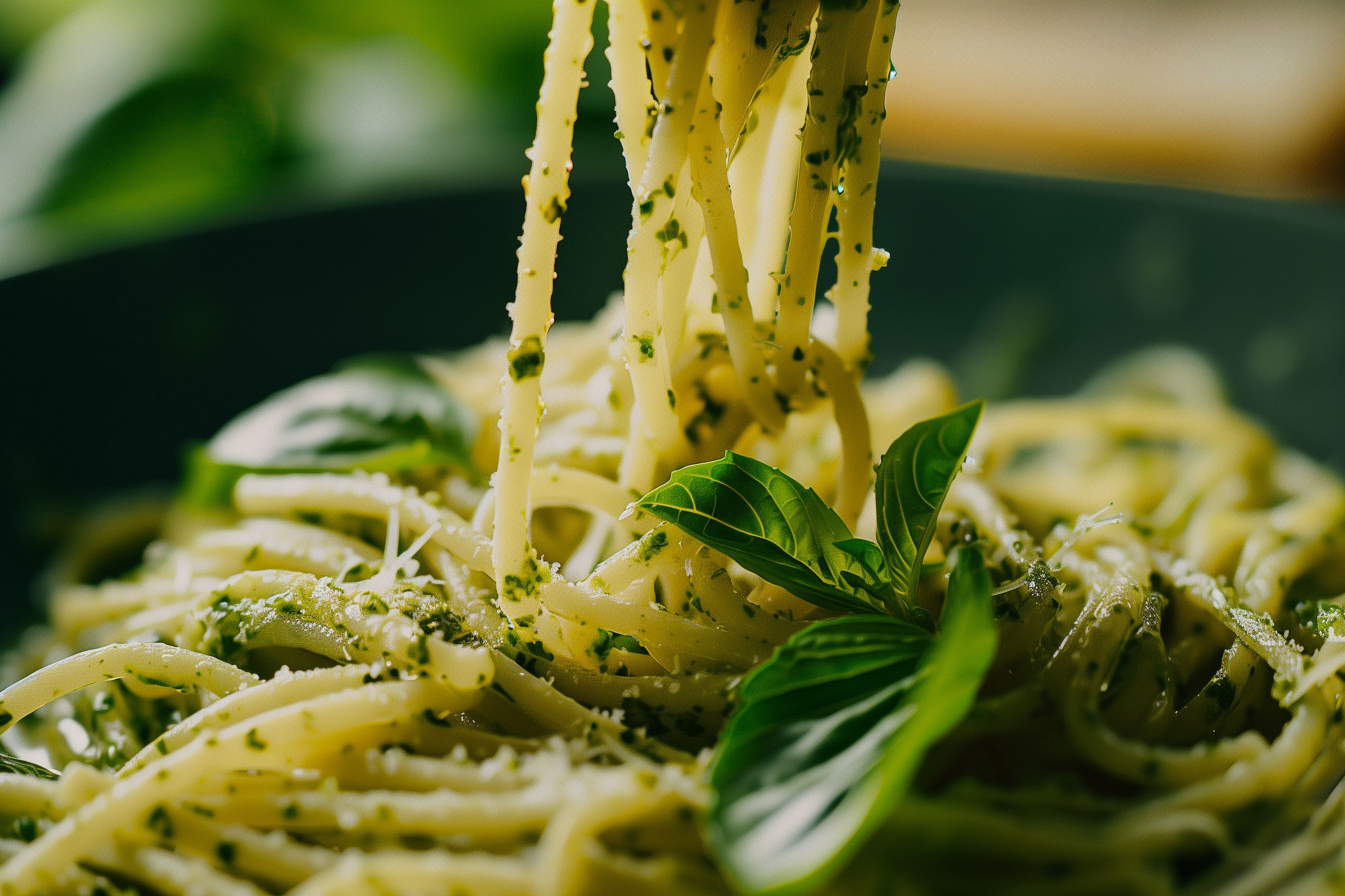 Dieses Foto zeigt eine appetitliche Nahaufnahme einer Portion Basilikum-Pesto-Pasta. Die Nudeln sind mit grünen Basilikumblättern und feinen Pesto-Sauce-Tropfen dekoriert, was dem Gericht einen frischen und leckeren Eindruck verleiht. Das Bild eignet sich hervorragend für Foodblogs, Kochrezepte oder andere kulinarische Themen. Als hochwertiges Stockfoto in hoher Auflösung steht es unter einer Creative-Commons-Lizenz kostenlos zum Download zur Verfügung.