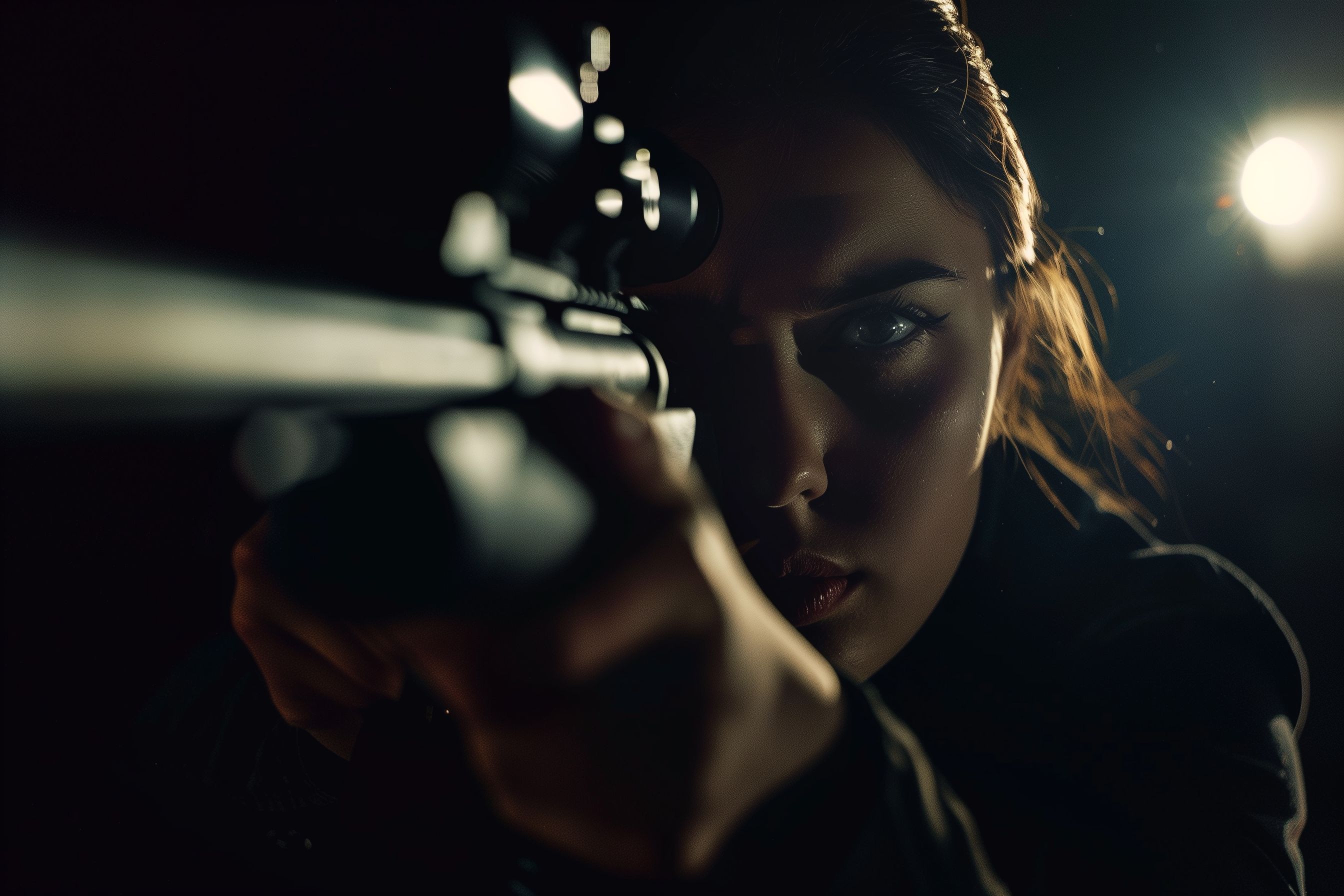 Das Bild zeigt eine Frau, die im Dunkeln konzentriert mit einem Gewehr zielt. Die düstere Beleuchtung und die intensive Mimik der Fotografin erzeugen eine Atmosphäre von Spannung und Bedrohung. Das Foto könnte für einen Thriller-Film oder eine Kriminal-Reportage eingesetzt werden, aber auch für Werbung zu Themen wie Selbstverteidigung oder strategisches Vorgehen im Geschäftsleben. Als hochauflösendes Stockfoto unter einer Creative-Commons-Lizenz ist es vielseitig einsetzbar, z.B. in Blogbeiträgen, Newslettern oder sozialen Medien.