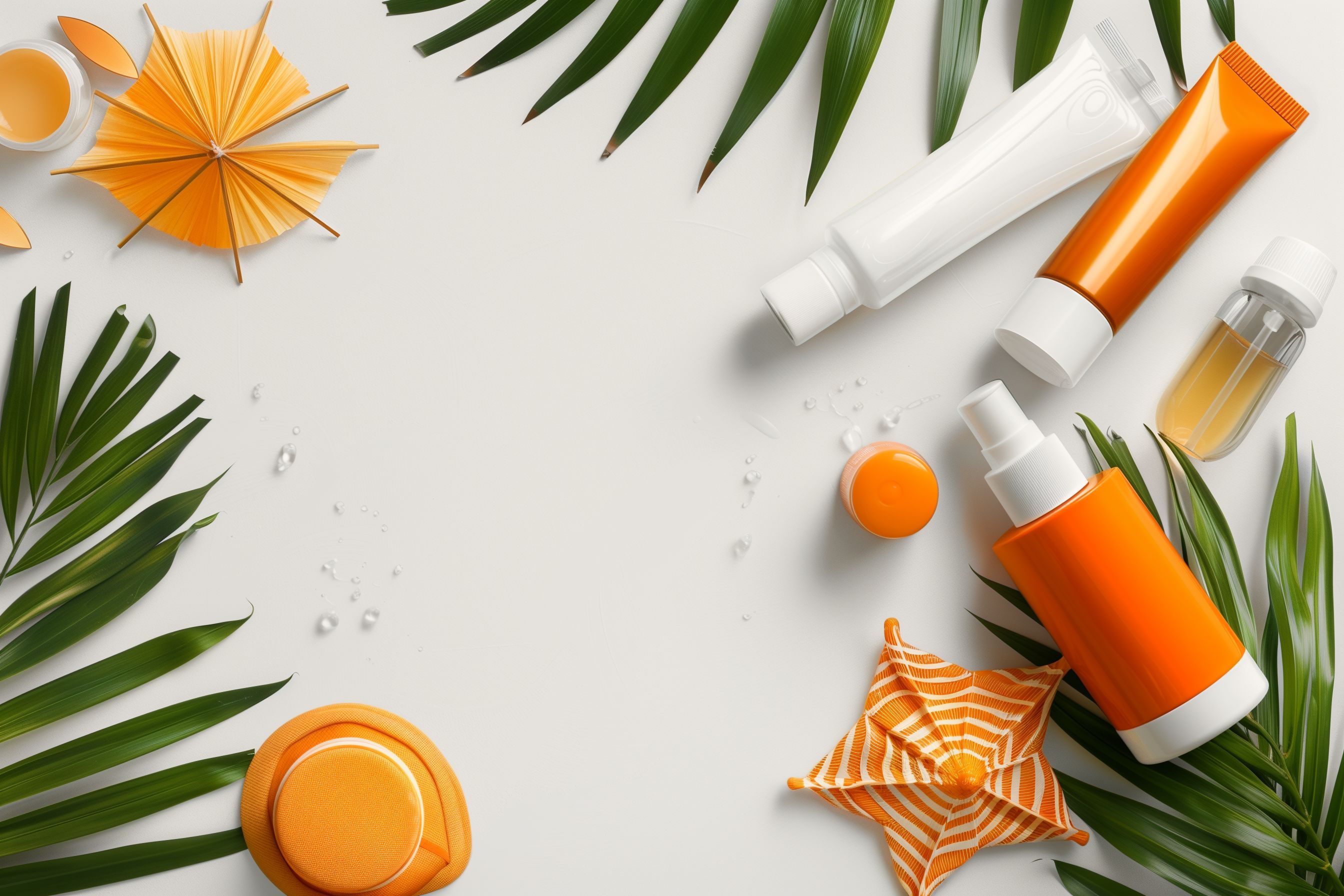 Dieses Bild zeigt eine stimmungsvolle Anordnung von Sonnenpflege-Produkten, umgeben von tropischen Blättern auf weißem Hintergrund. Die Komposition ist minimalistisch und legt den Fokus auf die orangefarbenen Produkte, die durch die grünen Blätter einen natürlichen Kontrast erhalten. Das Foto eignet sich hervorragend für den Einsatz in Blogs, Newslettern, sozialen Medien oder Werbekampagnen rund um Themen wie Sommerstimmung, Urlaubsfeeling, Hautpflege oder Wellness. Als kostenloses Stockfoto in hoher Auflösung unter einer Creative-Commons-Lizenz ist es vielseitig verwendbar.