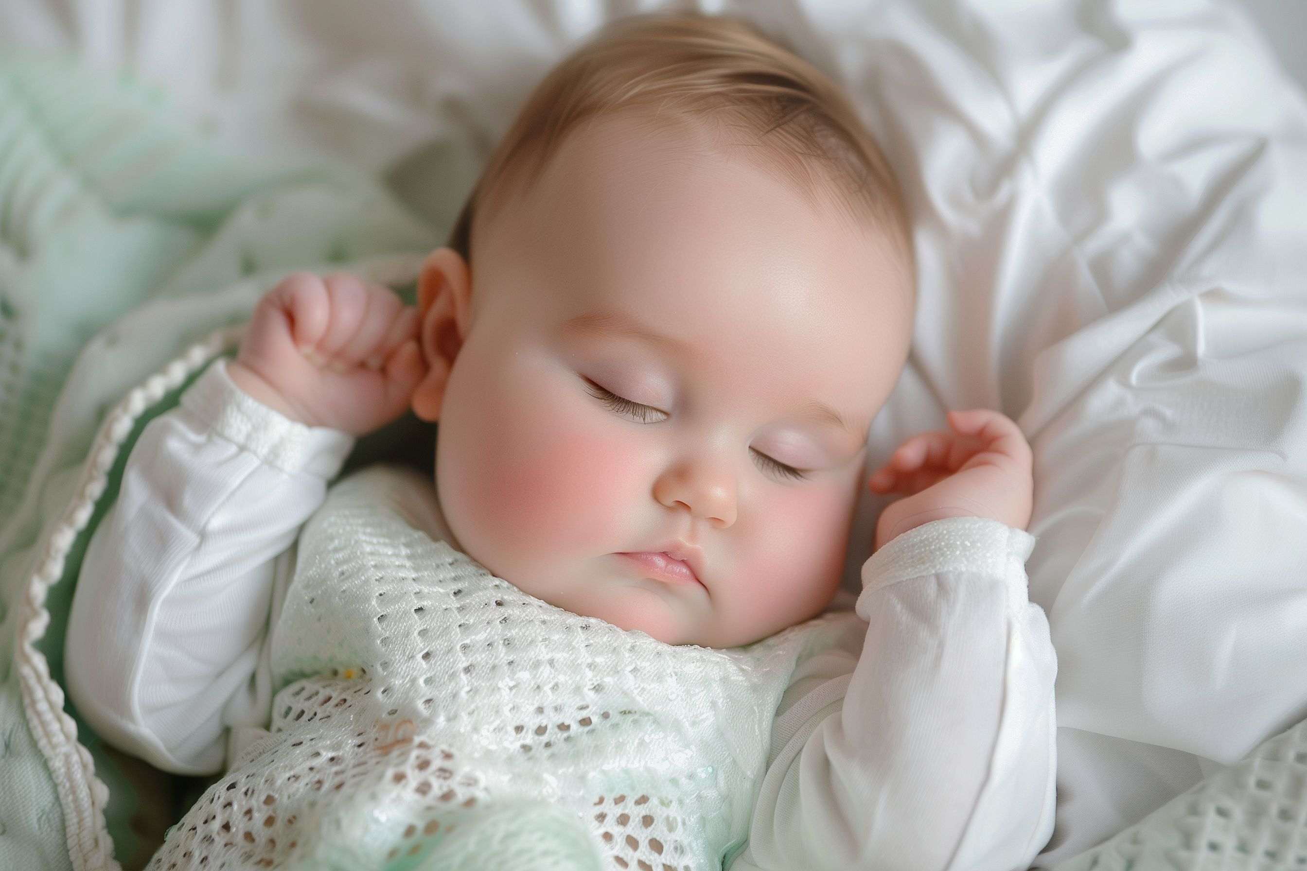 Dieses friedliche Bild zeigt einen kleinen Säugling, der tief und fest in einer weichen, pastellfarbenen Umgebung schläft. Das Baby liegt entspannt auf einer hellen Decke, die Ärmchen leicht angewinkelt. Sein Gesichtsausdruck ist ruhig und unbeschwert - ein Moment ungestörter Erholung und Geborgenheit. Die zarten Pastelltöne, das weiche Licht und die schlichte, aber elegante Komposition schaffen eine atmosphärische, fast schon poetische Stimmung. Dieses hochwertige Stockfoto wäre perfekt für Blogbeiträge, Newsletter-Illustrationen oder dekorative Werbezwecke rund um Themen wie Babypflege, Familienzeit oder Entspannung. Es steht unter einer freien Creative-Commons-Lizenz in hoher Auflösung zum kostenlosen Download bereit.