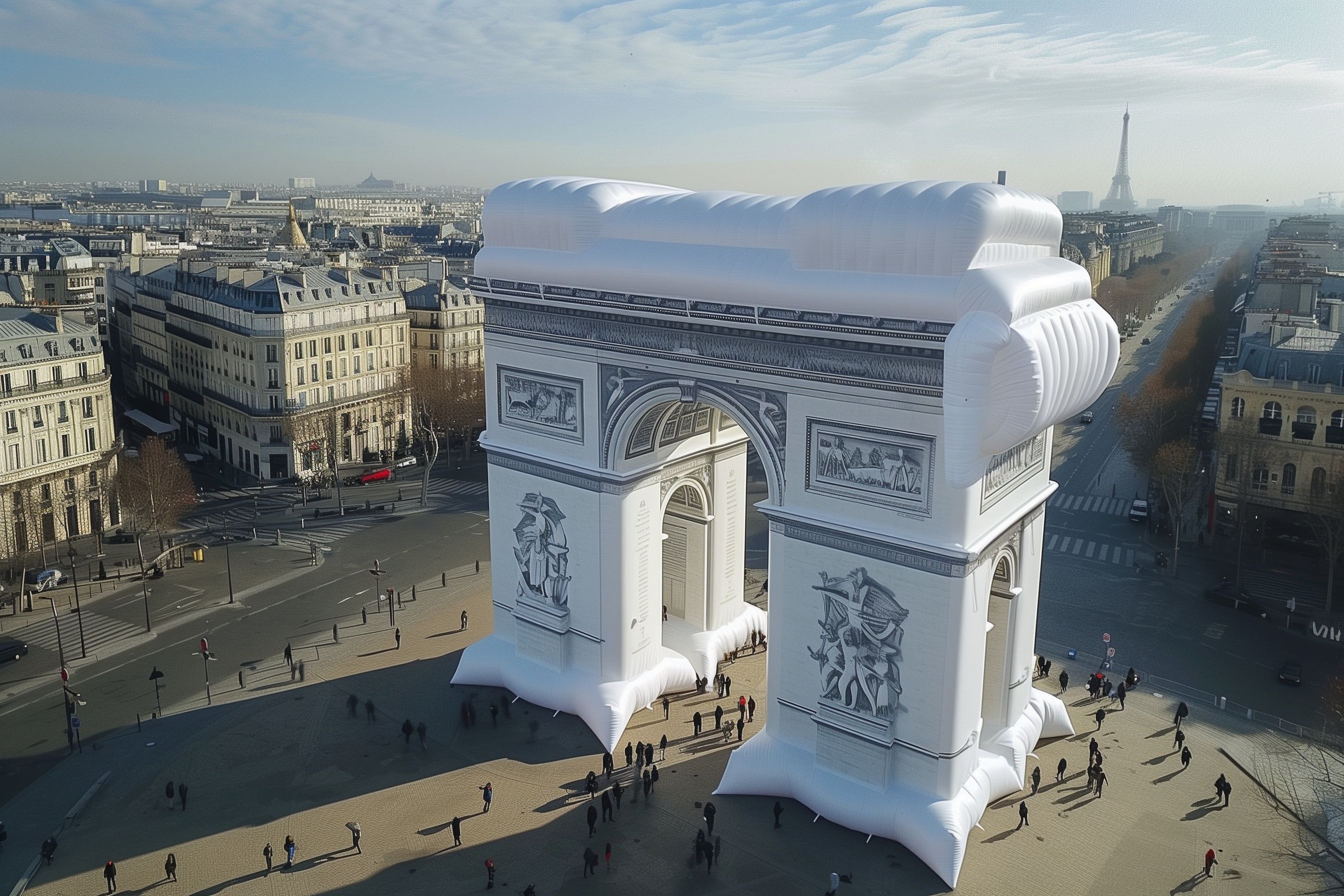 Dieses Foto zeigt ein aufblasbares Modell des berühmten Arc de Triomphe in Paris, einer der bekanntesten Sehenswürdigkeiten der französischen Hauptstadt. Das gigantische Denkmal thront inmitten der Stadt, umgeben von historischen Gebäuden und Straßen voller Menschen. Die Aufnahme aus der Vogelperspektive offenbart die beeindruckende Größe und Architektur des Triumphbogens sowie die belebte Umgebung mit Passanten. Dieses hochauflösende Stockfoto eignet sich hervorragend für den Einsatz in Blogs, Newslettern, sozialen Medien oder Werbematerialien rund um Paris, Architektur und Tourismus. Es steht unter einer Creative-Commons-Lizenz zur freien Verwendung zur Verfügung.