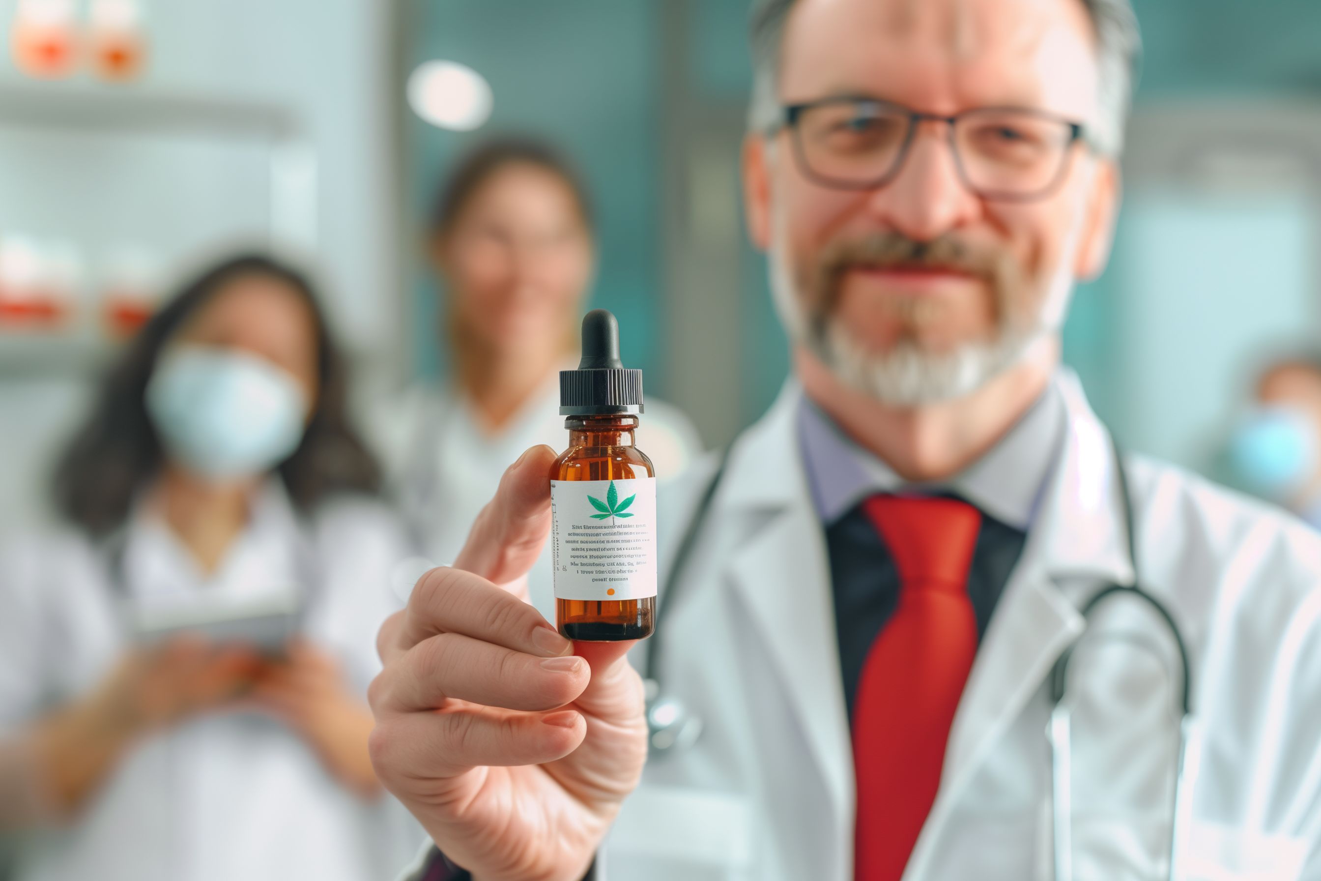Arzt präsentiert CBD-Öl-Flasche in medizinischer Umgebung von Marco Verch unter Creative Commons 2.0