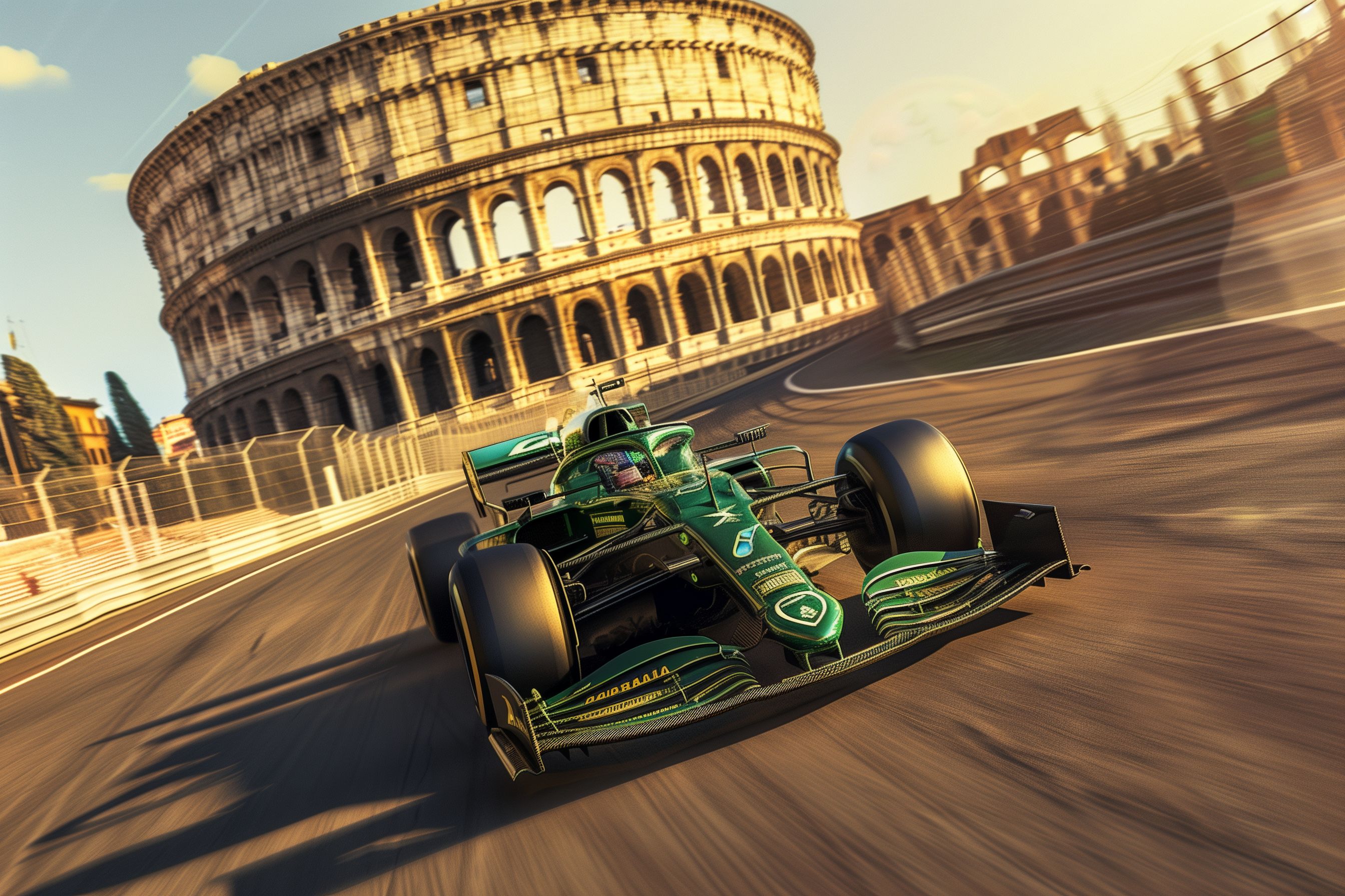 Das Bild zeigt einen Formel 1-Rennwagen, der mit hoher Geschwindigkeit vor dem imposanten Kolosseum in Rom vorbeifährt. Der Rennwagen ist in einem eleganten Grünton lackiert und wirkt hochmodern und aerodynamisch. Im Hintergrund ist die ikonische Silhouette des antiken römischen Amphitheaters zu sehen, was einen faszinierenden Kontrast zwischen Vergangenheit und Gegenwart, Tradition und Fortschritt schafft.