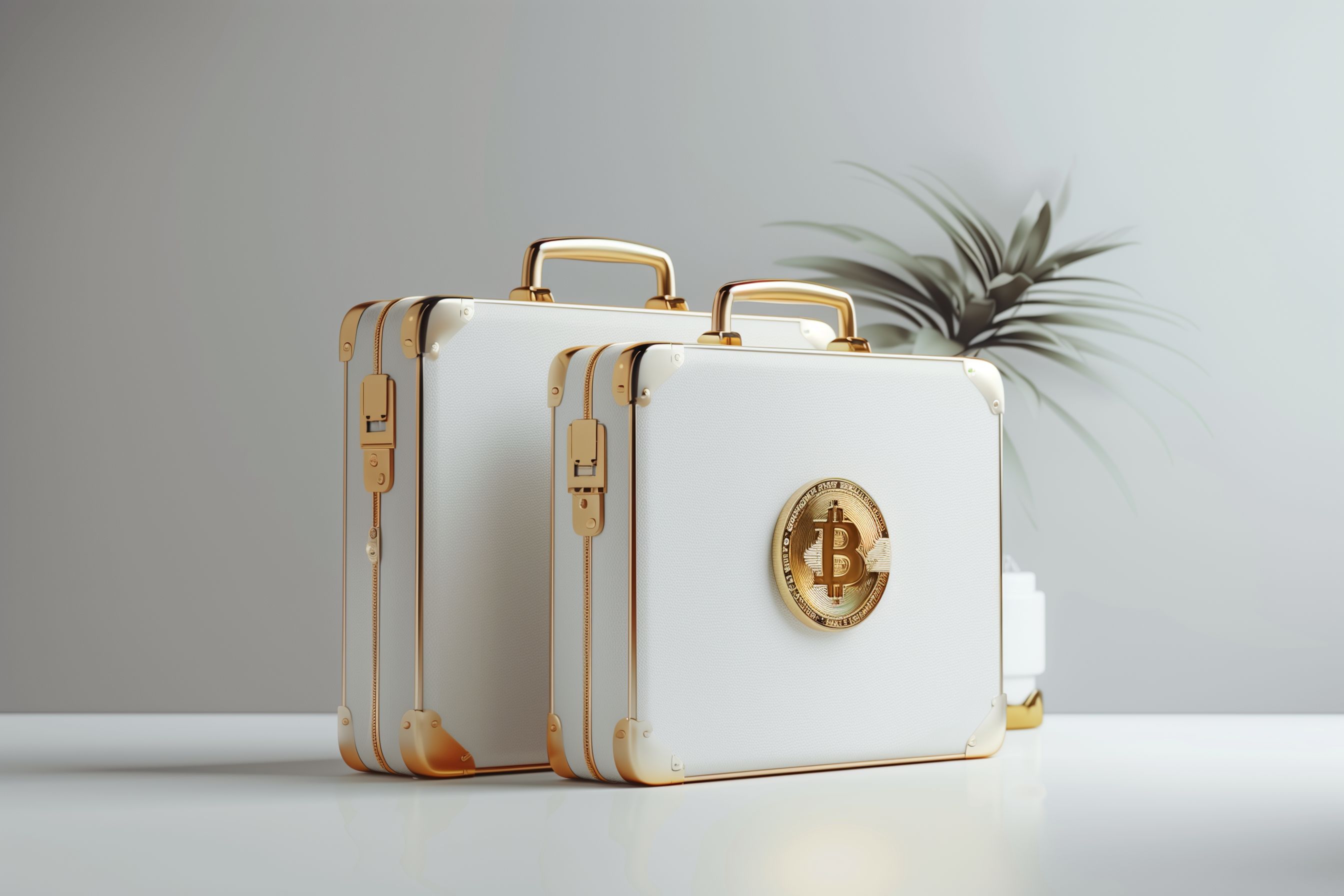 Das Bild zeigt zwei edle Reisekoffer in eleganter Farbkombination aus Weiß und Gold. Das Hauptaugenmerk liegt auf den beiden Koffern, die durch ihre hochwertige Optik und das auffällige Bitcoin-Logo auf der Vorderseite ins Auge stechen. Der Hintergrund ist schlicht gehalten, wodurch die Koffer im Mittelpunkt stehen. Diese Premium-Accessoires vermitteln einen Eindruck von Exklusivität, Wohlstand und einer modernen, digitalen Lebensweise. Das Foto eignet sich hervorragend für den Einsatz in Werbung, Blogs oder Social Media rund um Themen wie Finanzen, Kryptowährungen, Luxusprodukte oder Businesslösungen. Als kostenloses Stockfoto in hoher Auflösung und unter einer Creative-Commons-Lizenz steht es Ihnen zur freien Verwendung zur Verfügung.