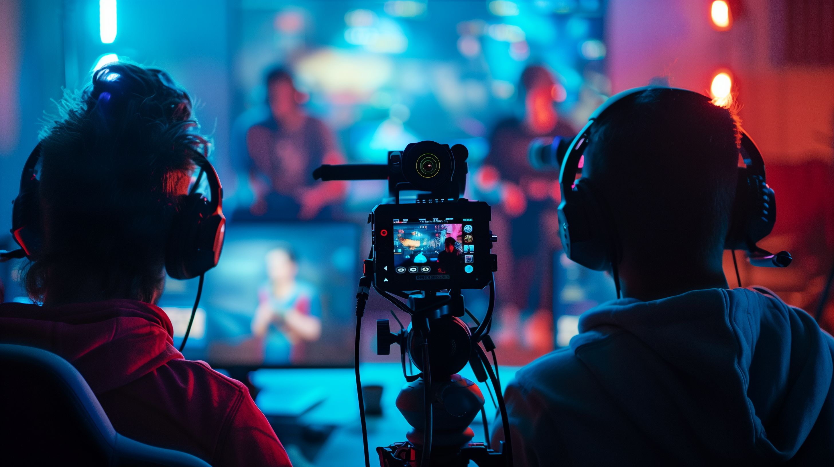 Das Bild zeigt eine Szene eines Live-Streaming-Events für Gamer. Im Vordergrund sind zwei Spieler zu sehen, die mit Kopfhörern vor einer Kamera sitzen. Der Raum ist in blaues Licht getaucht, was eine moderne und technologische Atmosphäre schafft. Im Hintergrund sind weitere Personen erkennbar, die ebenfalls an dem Event teilnehmen.