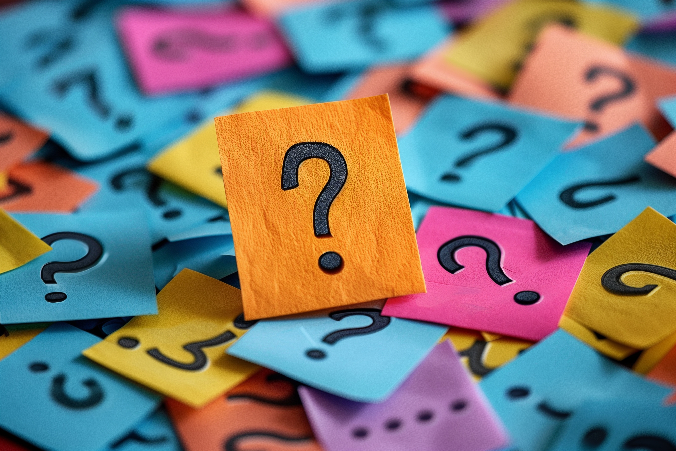 Das Bild zeigt eine Vielzahl an bunten, hölzernen Würfeln, auf denen jeweils ein schwarzes Fragezeichen abgebildet ist. Die Würfel sind in unterschiedlichen Farben gehalten, wie Blau, Gelb, Orange und Pink, was dem Bild einen kreativen und lebendigen Eindruck verleiht.