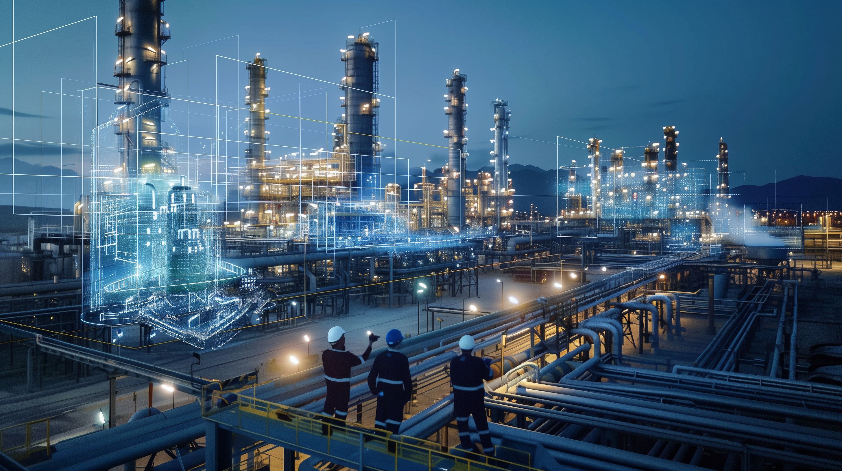 Das Bild zeigt eine moderne Industrieanlage, vermutlich eine Ölraffinerie, bei Nacht. Die Fabrikgebäude und Tanks sind prägnant beleuchtet und heben sich vor dem dunklen Nachthimmel ab. Im Vordergrund sind Arbeiter in Schutzausrüstung zu sehen, die offenbar die Anlage überwachen oder warten. Die Szene vermittelt einen Eindruck von Digitalität und Fortschritt in der Industrie. Dieses hochauflösende Stockfoto eignet sich hervorragend für redaktionelle Beiträge, Werbekampagnen oder Präsentationen rund um Themen wie Energiewirtschaft, Industriedesign, Automatisierung und Industrie 4.0. Das Foto steht unter einer Creative-Commons-Lizenz zur kostenfreien Nutzung zur Verfügung.