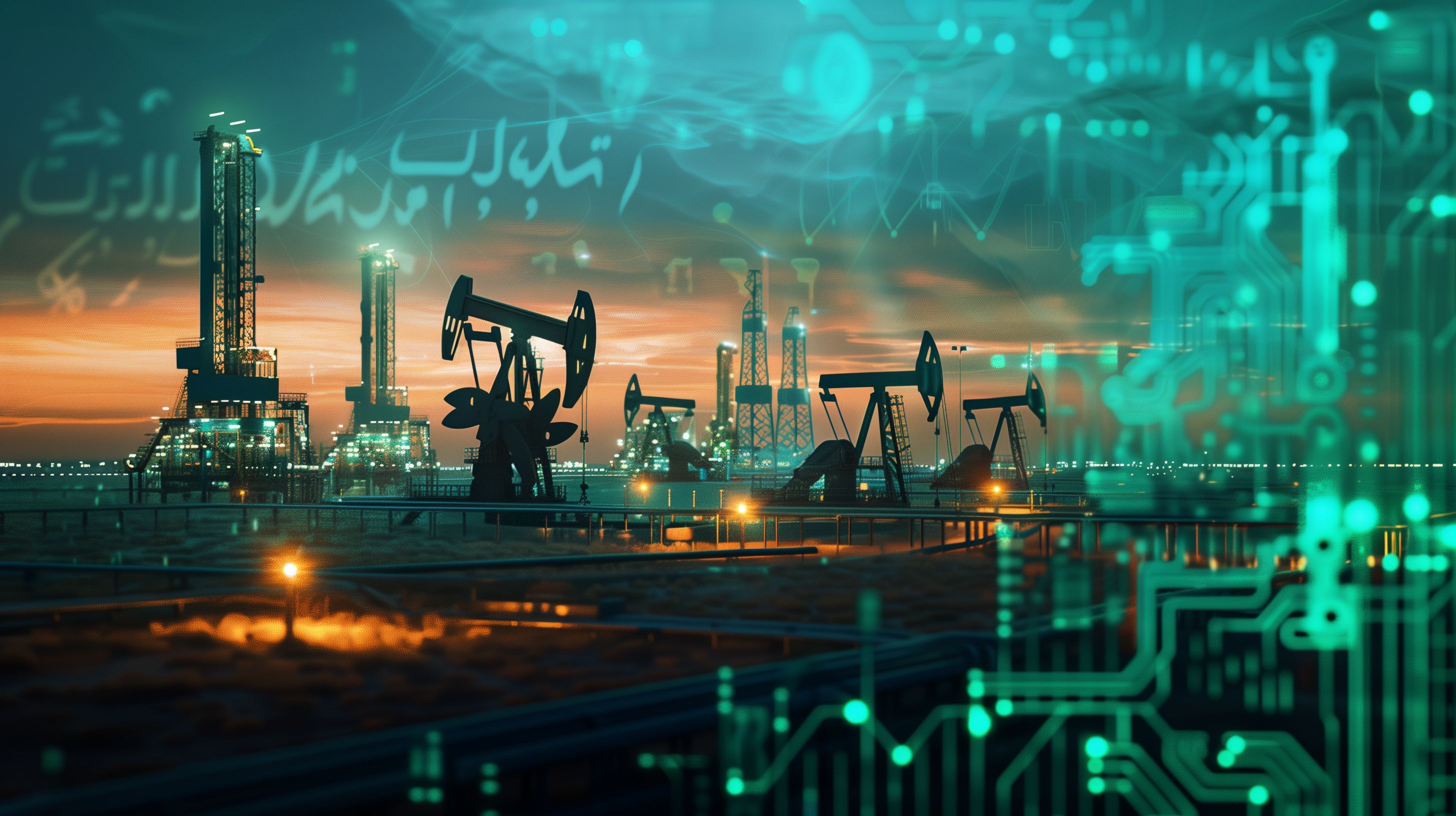 Dieses digitale Stockfoto zeigt eine futuristische Darstellung der Ölförderung in der Wüste. Zu sehen sind mehrere Ölpumpen vor einem surreal beleuchteten Industriekomplex, der von technologischen Elementen wie Schaltkreisen und Datenbahnen umgeben ist. Die Szene vermittelt den Eindruck einer hochautomatisierten, digital vernetzten Ölförderung der Zukunft. Das Bild eignet sich hervorragend für Blogs, Newsletter oder Social-Media-Beiträge zum Thema Energiewirtschaft, Digitalisierung und technologische Innovationen. Als kostenloses Stockfoto in hoher Auflösung und unter Creative-Commons-Lizenz verfügbar, lässt es sich vielseitig in Projekten einsetzen.